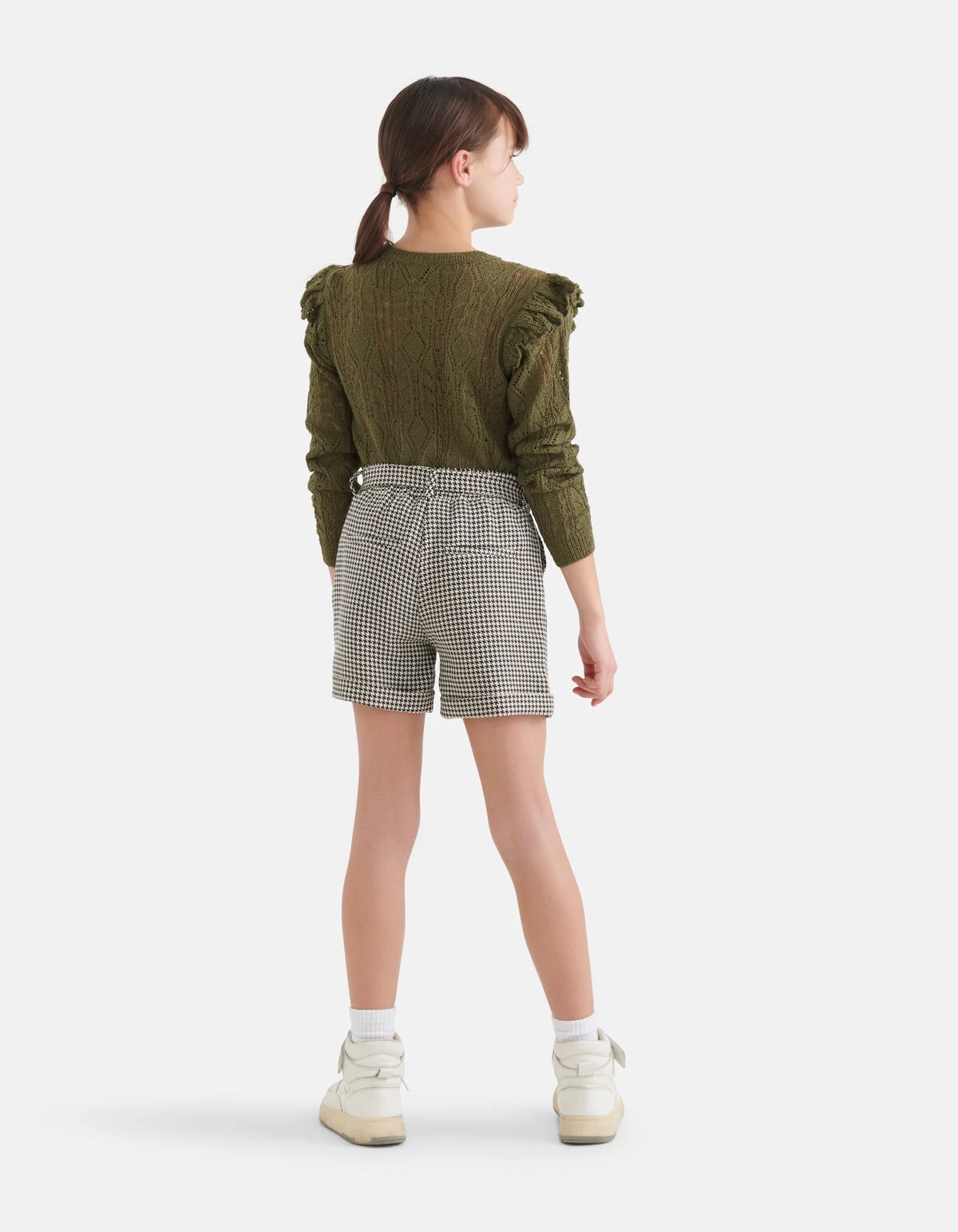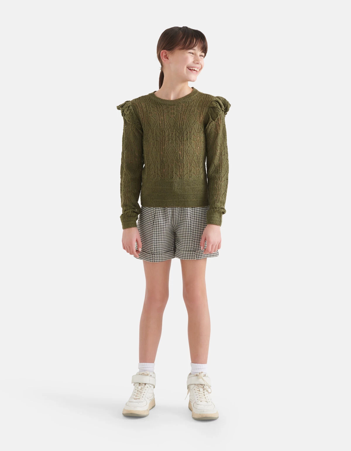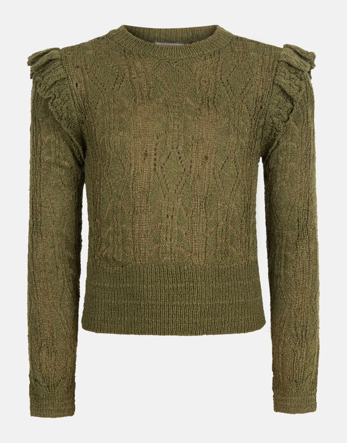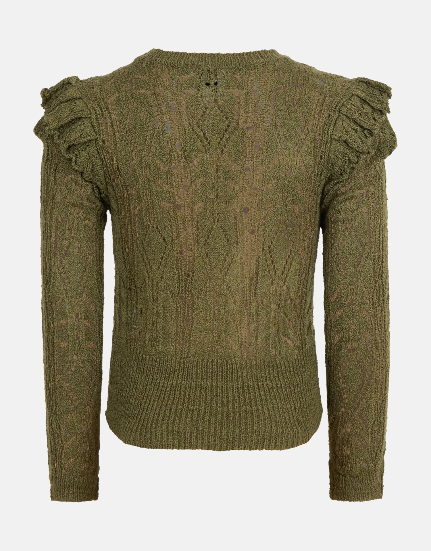 The greener the better! De Ajour Top heeft lange mouwen, een ronde hals en een aansluitende fit. Het item heeft een donkergroene kleur met een ajour breiwerk. Dit breiwerk heeft een kanten effect, waardoor er opzettelijk gaatjes in het breiwerk is gemaakt. Een leuk detail is de ruffle op de schouders! Draag het samen met de bijpassende donkergroene rok of een plisse broek voor een stijlvolle look!