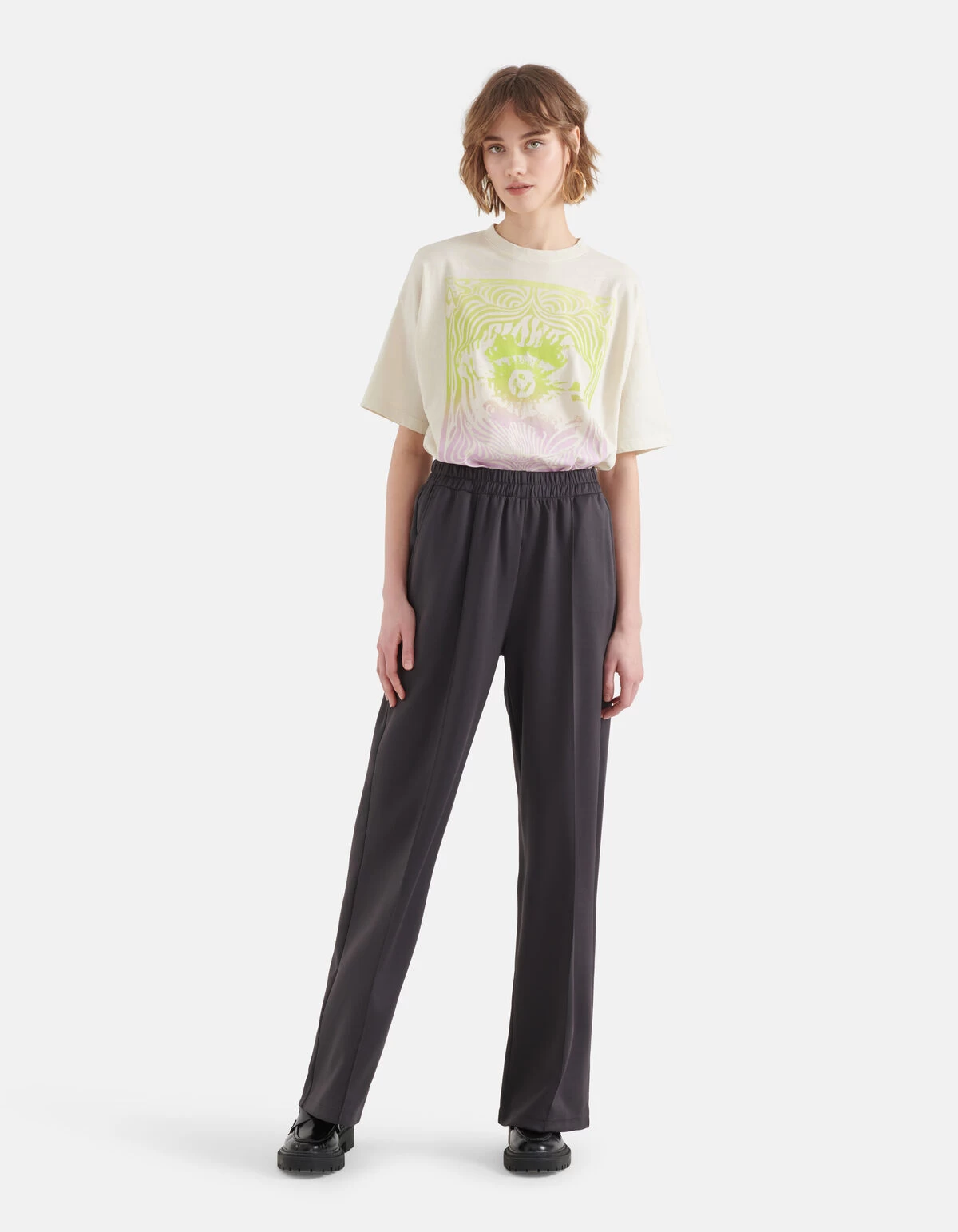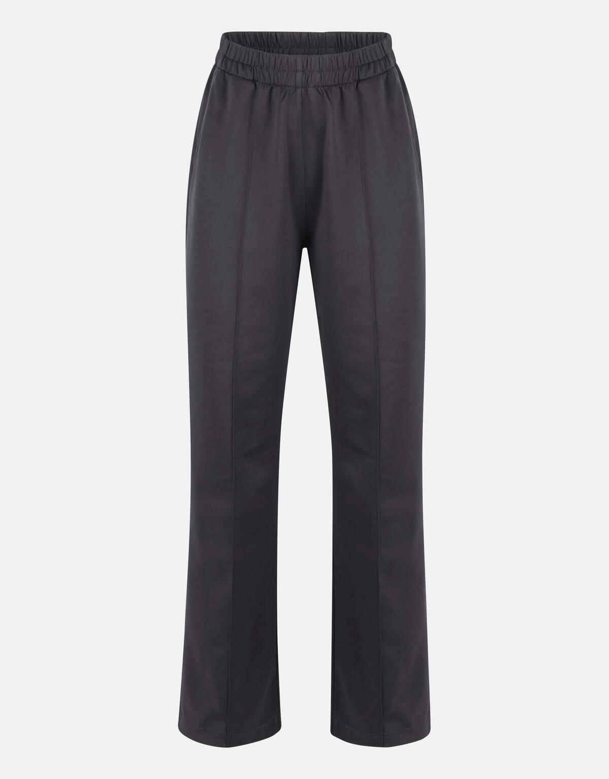 Comfy & stylish! De Basis Jogger Broek heeft een hoge taille, een elastieke tailleband, steekzakken, paspelzakken en een loose fit met uilopende broekspijpen. Het item wordt gekenmerkt door de donkergrijze kleur met een vouwnaad op de voorzijde. Het is gemaakt van polyester en elastaan. Door deze samenstelling is het vormvast, sterk van kwaliteit en rekt het subtiel mee. Combineer het samen met een oversized t-shirt en loafers voor een edgy look! Het model heeft een lengte van 179 cm en draagt maat S. Het artikel heeft een binnenbeenlengte van 81 cm bij maat S.