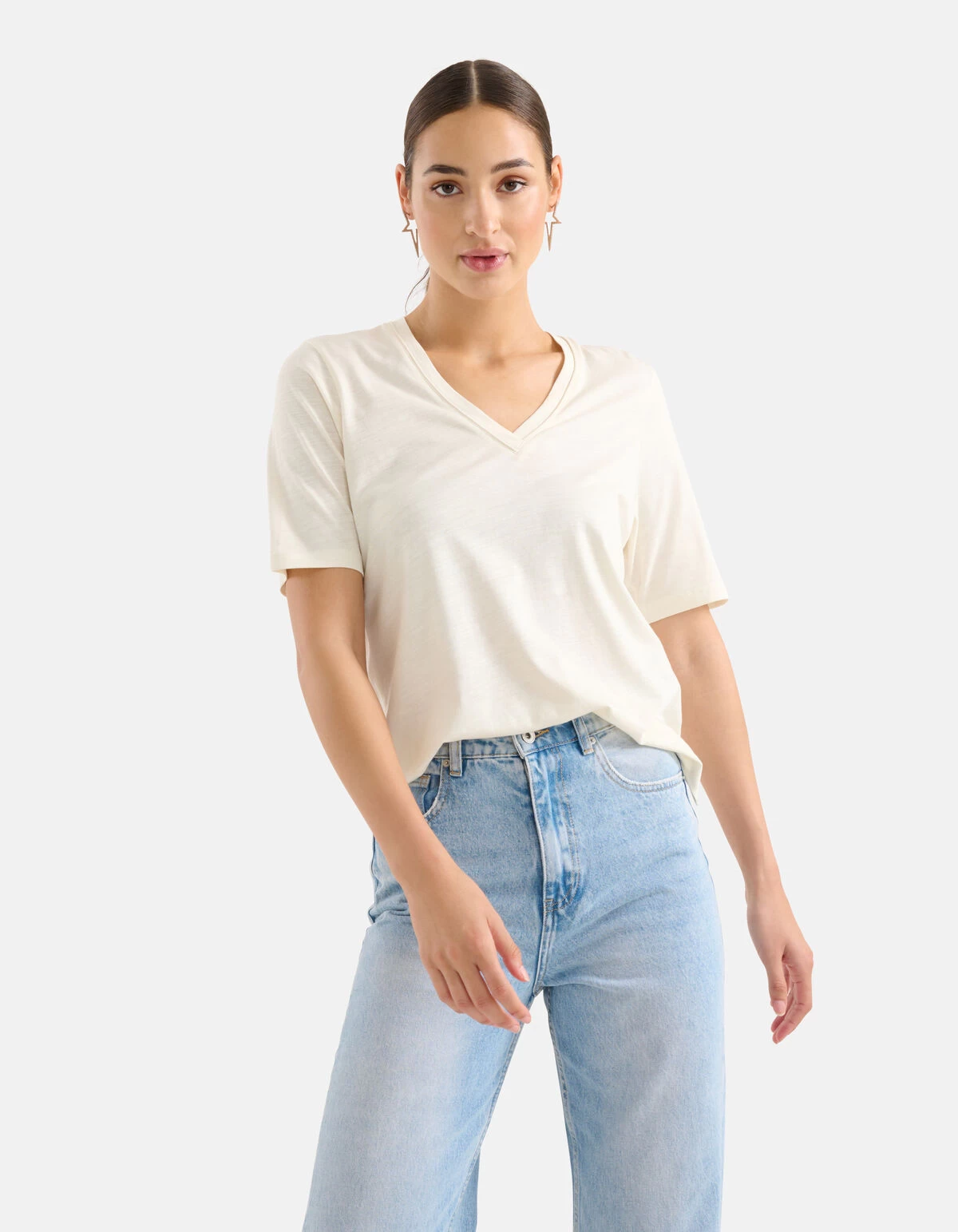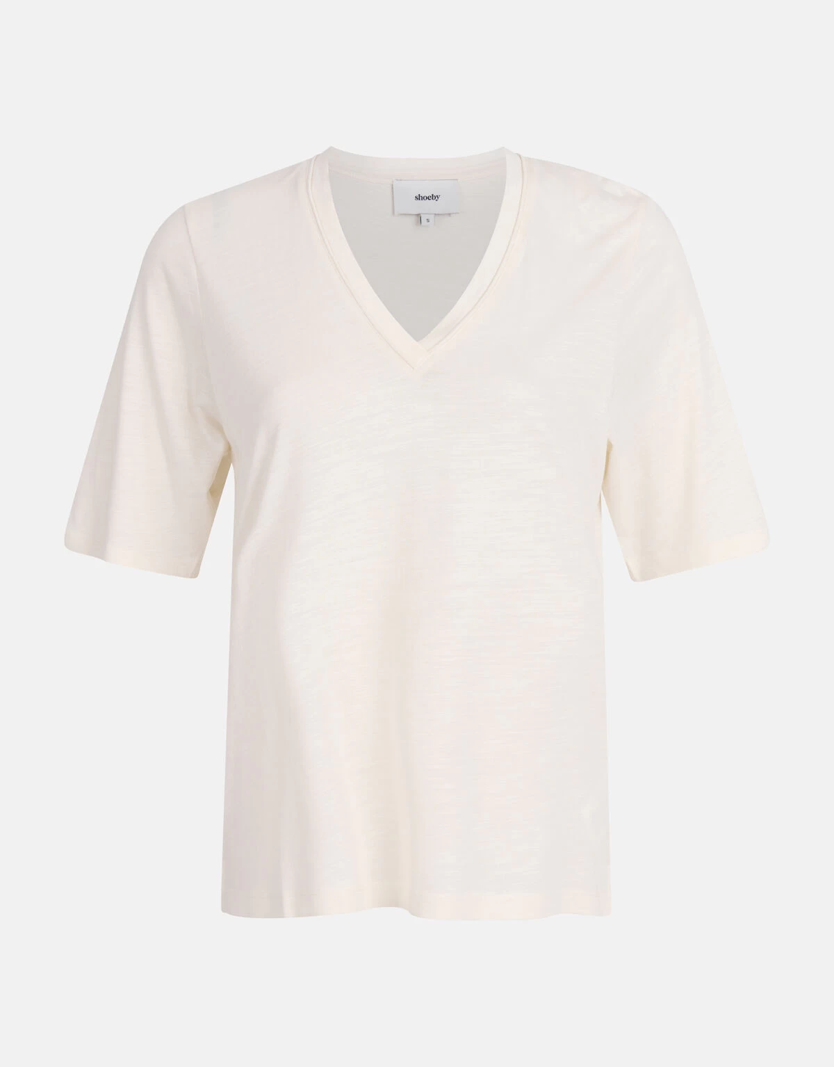 The perfect basic! Het Basis V-hals T-shirt heeft een korte mouw, een v-hals en een regular fit. Het item wordt gekenmerkt door de witte kleur met een lichte structuur in de stof. Verder heeft het t-shirt een fijne stof kwaliteit, waardoor het perfect is voor elk seizoen. Het is gemaakt van katoen en viscose, hierdoor draagt het comfortabel, is het kleurvast en sterk van kwaliteit. Het productieproces van organic, ook wel biologisch katoen, is minder schadelijk en belastend voor het milieu. Het katoen wordt verbouwd zonder gebruik van chemische bestrijdingsmiddelen. In plaats van pesticide, worden natuurlijke middelen gebruikt om de plant te beschermen tegen ongedierte. Ook wordt er efficienter omgegaan met water, want voor het verbouwen van katoen is ontzettend veel water nodig. Maak de look compleet met een wide leg jeans en een gilet voor een casual look! Het model heeft een lengte van 182 cm en draagt maat S. Het artikel heeft een totale lengte van 64,5 cm bij maat S.