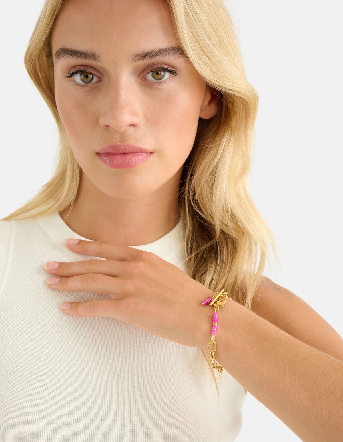 Sophisticated with a casual twist! De Beaded Chain Armband wordt gekenmerkt door de gouden kleur, de chain ketting en de roze en gouden kraaltjes. De armband heeft een haaksluiting, hierdoor kan je het makkelijk open-en dicht maken. Combineer het samen met de bijpassende beaded chain ketting voor een complete set!