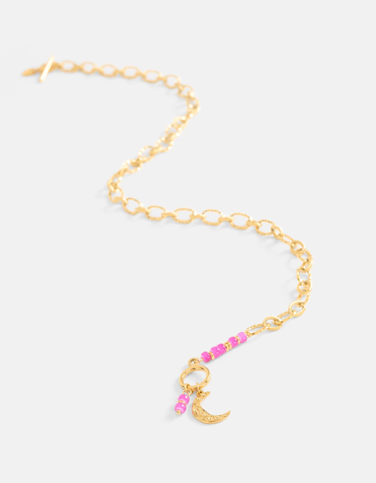 Sophisticated with a casual twist! De Beaded Chain Ketting wordt gekenmerkt door de gouden kleur, de chain ketting en de roze kraaltjes. Een leuk detail is de bedel in de vorm van een maan, hierdoor krijgt het een speels effect. De ketting heeft een haaksluiting aan de voorzijde. Deze is makkelijk open-en dicht te maken. Combineer het samen met de bijpassende beaded chain armband voor een complete set!