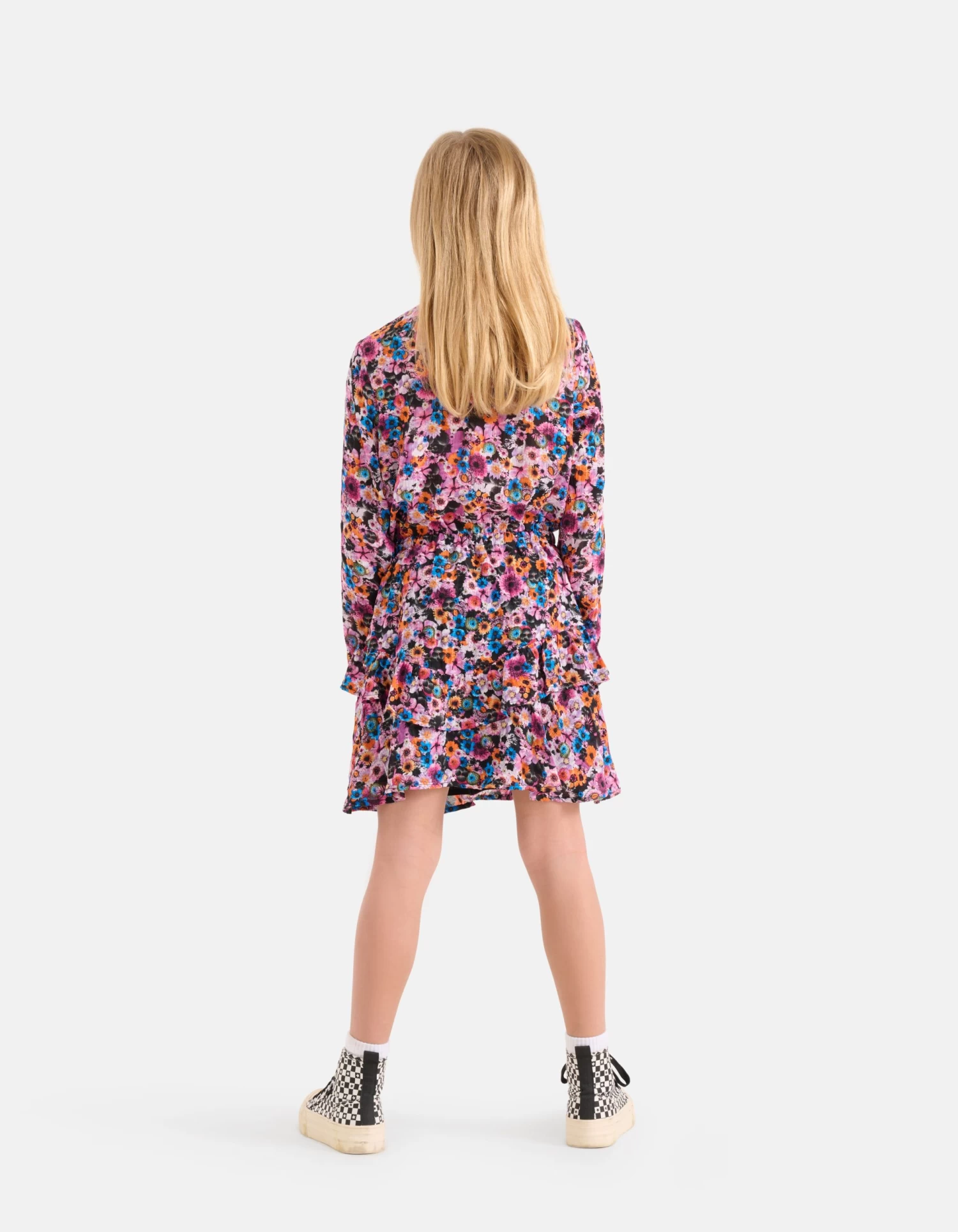 Flower bomb! De Bloemenprint Jurk heeft lange mouwen, een hoge hals, een knoopsluiting op de achterzijde en een uitlopend model. Het item wordt gekenmerkt door de paarse kleur met een all-over bloemenprint in verschillende kleuren. Verder heeft de jurk tape details bij de schouders en ruffles aan de onderzijde. Een leuk detail is de elastieke band in de taille met een aansnoerkoord, hierdoor kan de jurk mooi aangesloten zitten. Handig is de onderrok voor je kleine, zodat de jurk niet doorschijnt. Combineer het samen met een teddy gilet en een paar chunky laarzen en je bent good to go!