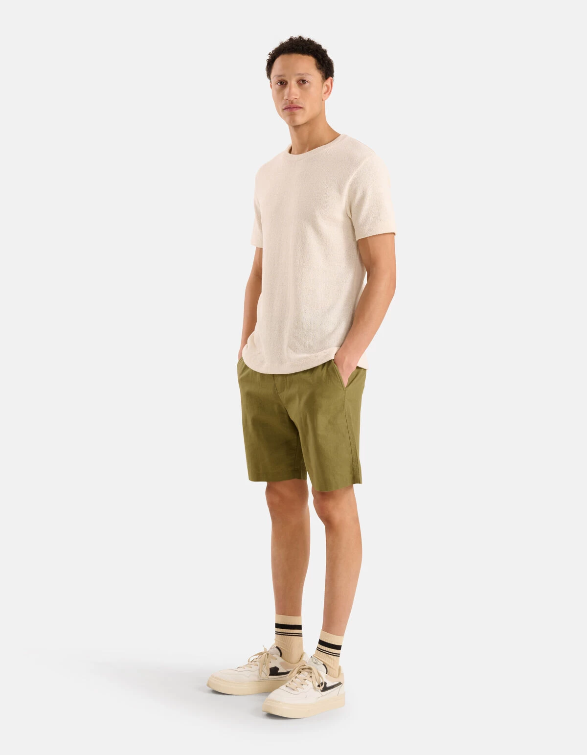 Trending! Het Boucle T-shirt heeft een korte mouw, een hoge ronde hals en een relaxed fit. Het item wordt gekenmerkt door de gebroken witte kleur met een trendy boucle structuur in de stof. Door de speciale manier van weven onstaat er een grove structuur. Een leuk detail is het subtiele Shoeby sparkle logo aan de voorzijde. Het is gemaakt van polyester en katoen, hierdoor is het sterk van kwaliteit, vormvast en draagt het comfortabel. Maak de look compleet met een donkergroene short en sneakers voor een sportieve look! Het model heeft een lengte van 189 cm en draagt maat M. Het artikel heeft een totale lengte van 70 cm bij maat M.