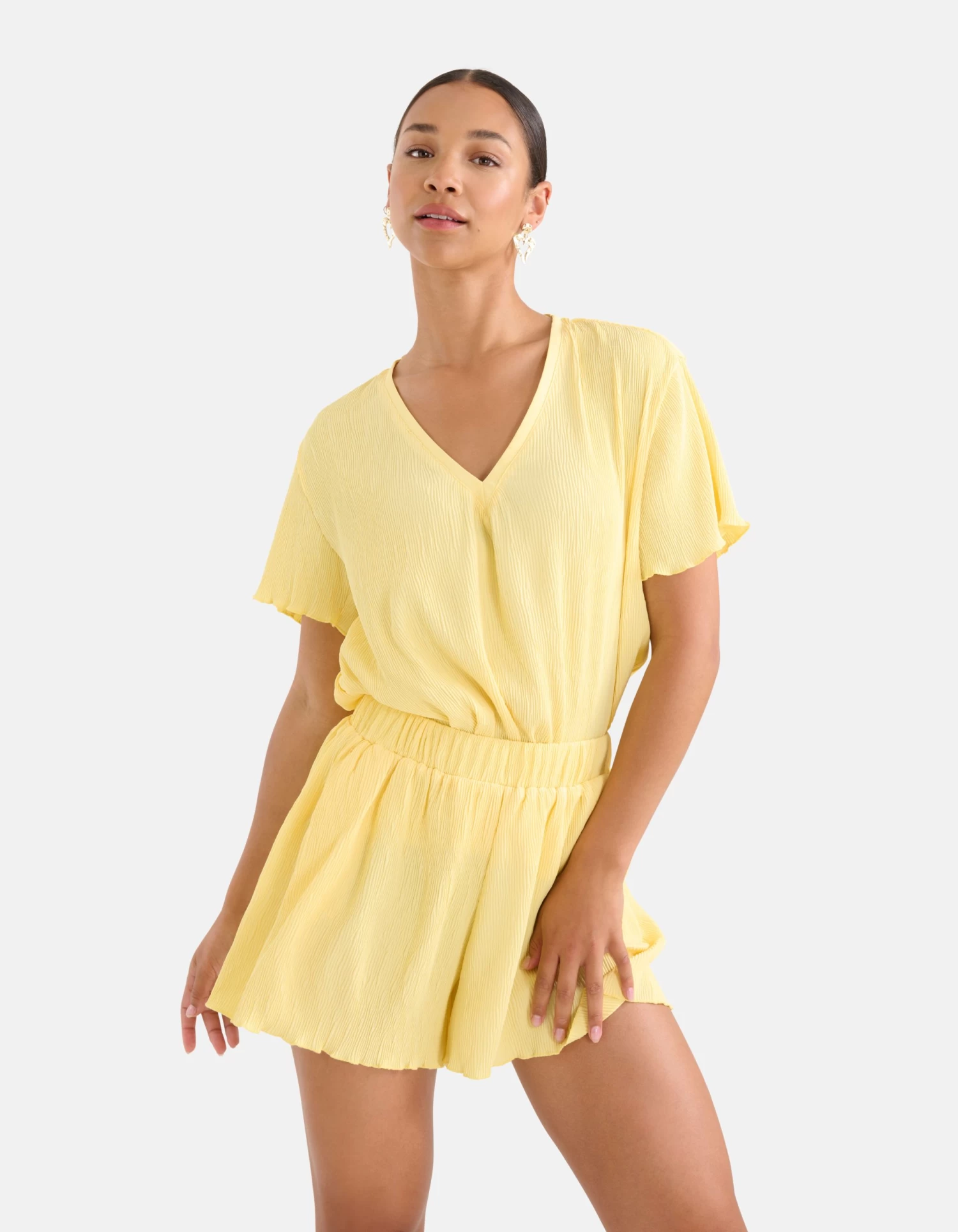 A color that instantly brightens up your look! Het Crinkle T-shirt heeft een korte mouw, een V-hals, een licht transparante stretch stof en een relaxed fit. Het item wordt gekenmerkt door de crinkle kwaliteit stof en de gele kleur. Door de kleur wordt je look direct opgelicht met een frisse en vrolijke uitstraling. Door de crinkle krijgt het t-shirt een speels en gekreukt effect. Het is gemaakt van 100% polyester, hierdoor is het vormvast en sterk van kwaliteit. Combineer het samen met een bijpassend shortje en je bent ready to go! Wil je het t-shirt liever meer aangesloten dragen? Ga dan voor één maat kleiner. Het model heeft een lengte van 182 cm en draagt maat S. Het artikel heeft een totale lengte van 65 cm bij maat S.