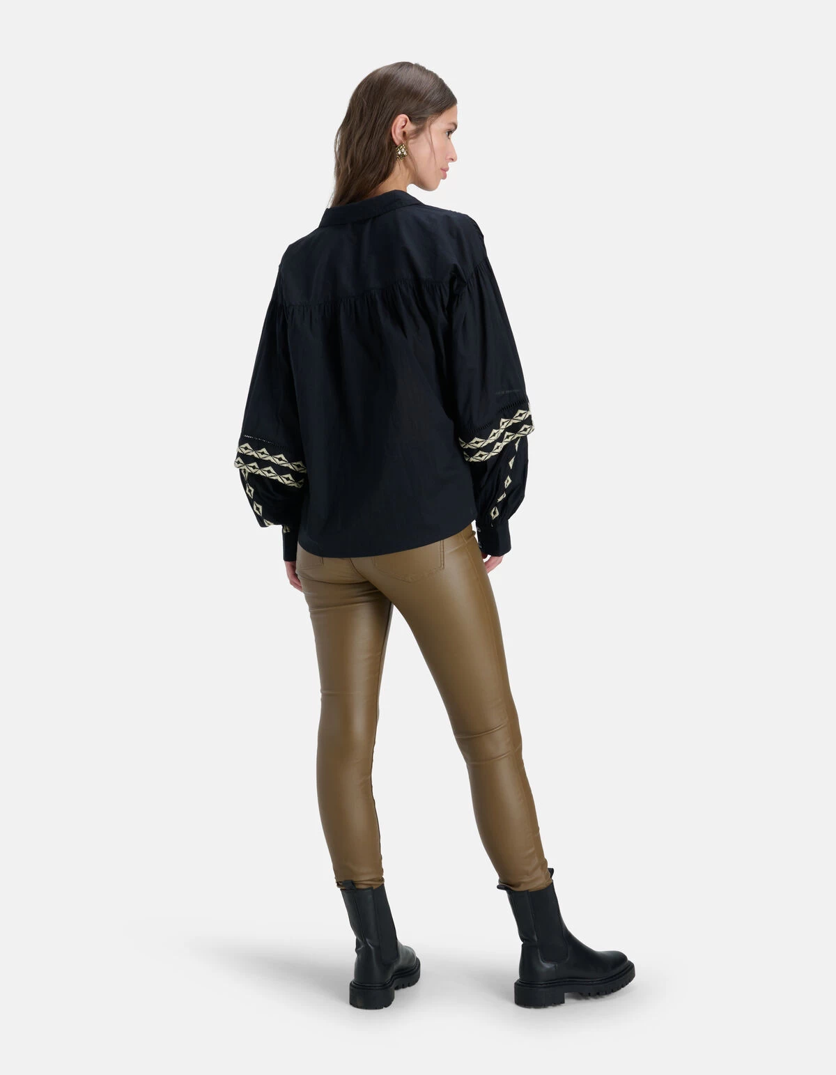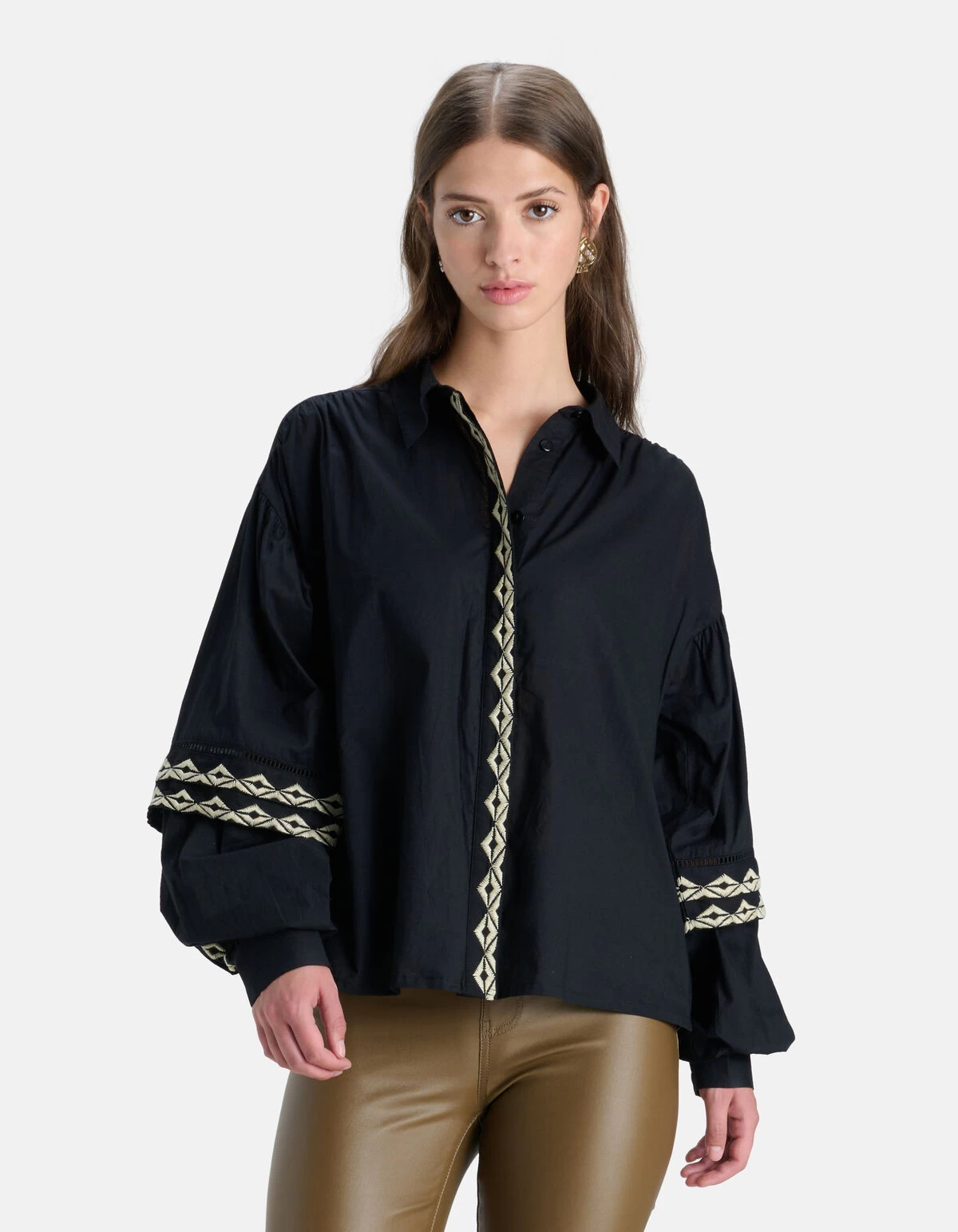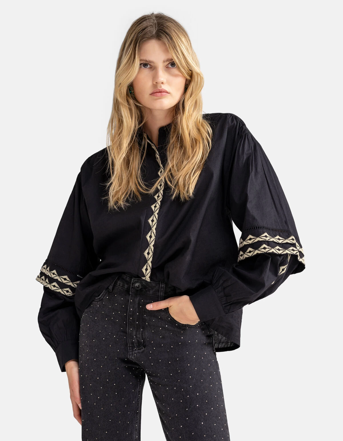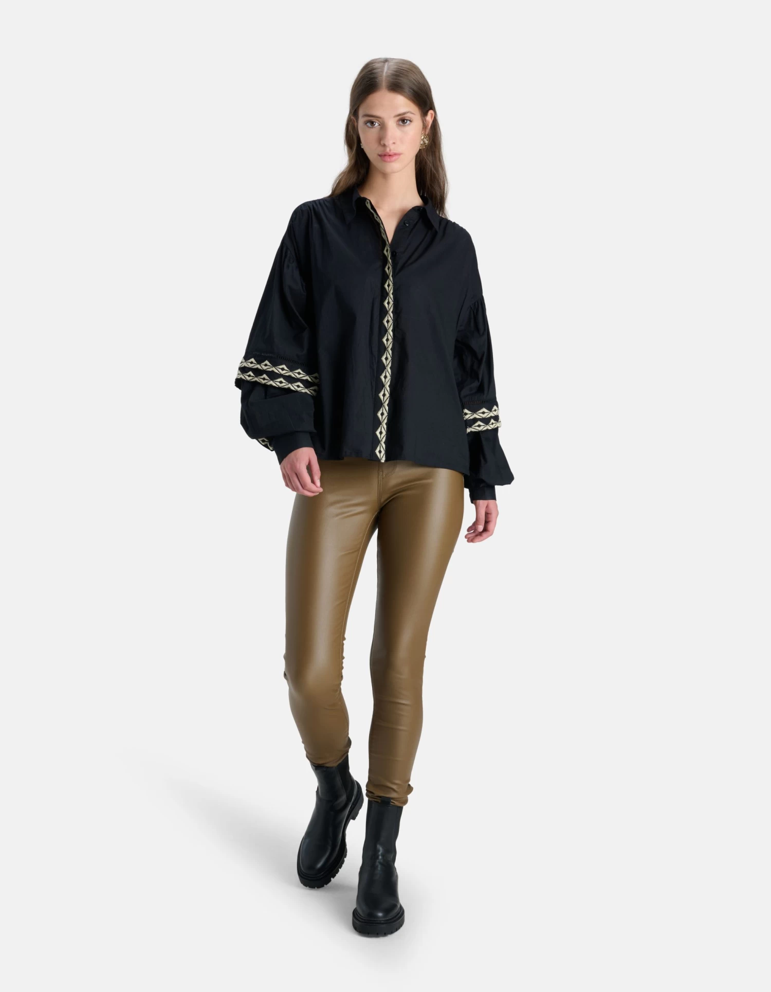 It’s all about the details! De Embroidery Blouse heeft lange volumineuze mouwen, een kraag, een knoopsluiting en een relaxed fit. Het item wordt gekenmerkt door de zwarte kleur met geborduurde details op de knoopsluiting en de mouwen. De borduursels hebben een gebroken witte kleur. Verder hebben de mouwen nog manchetten aan de onderzijde, waardoor de mouwen nog meer volume krijgen. Daarnaast heeft het nog tape inzetstukken voor een luxueuze uistraling. Het is gemaakt van 100% katoen, waardoor het sterk van kwaliteit is en comfortabel draagt. Combineer het samen met een coated legging en chelsea laarzen voor een every day look! Het model heeft een lengte van 179 cm en draagt maat S. Het artikel heeft een totale lengte van 66 cm bij maat S.