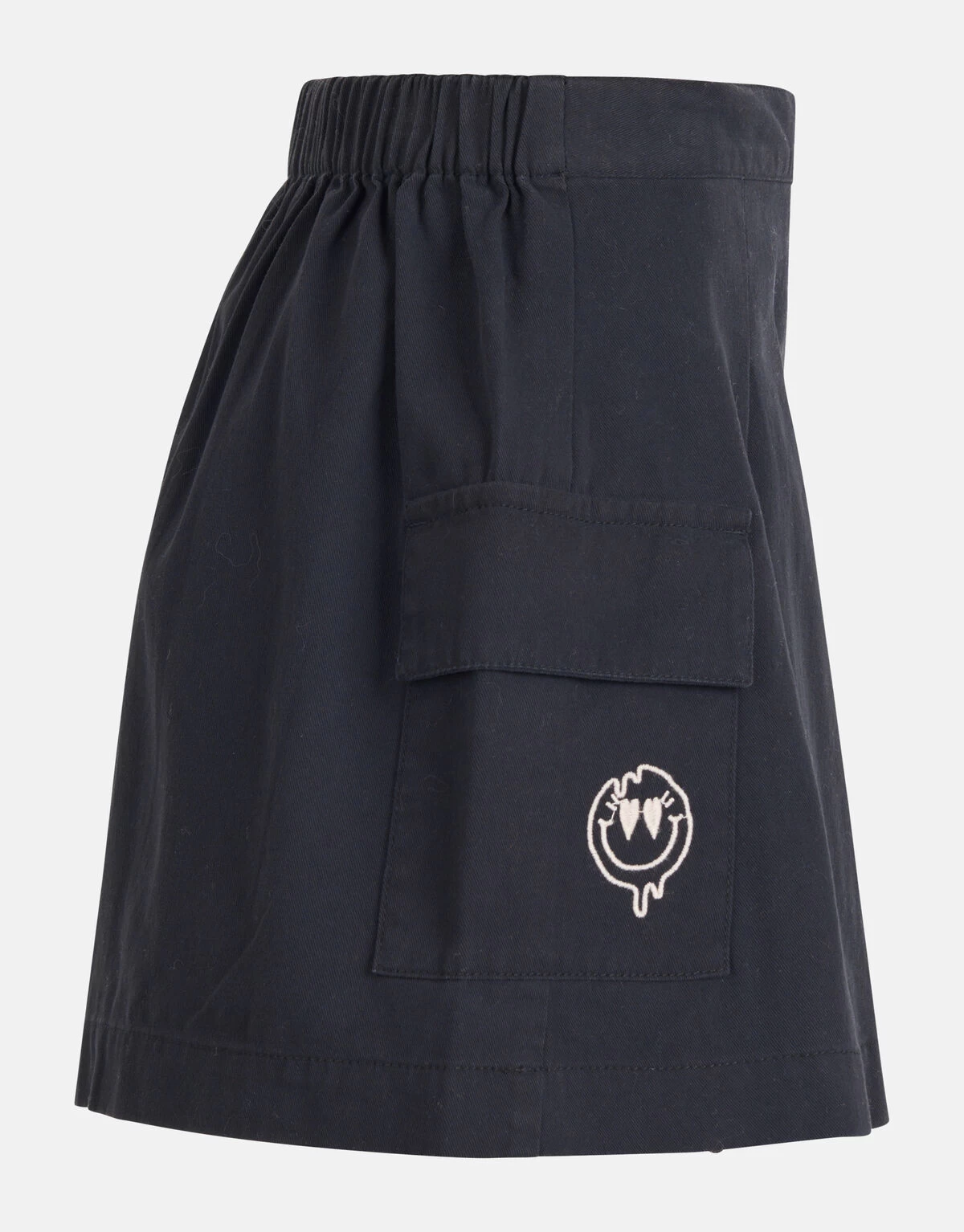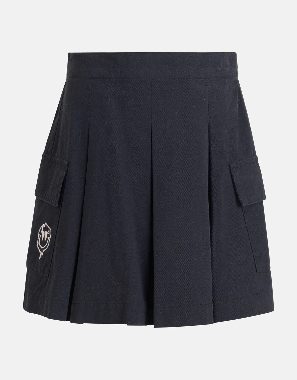 Elevate your look with embroidered details! De Embroidery Rok heeft een middelhoge taille, een non-stretch stof, een mini-lengte, een elastieke band in de taille en een uitlopend model. Het item wordt gekenmerkt door de pleat details aan de voorzijde, de donkergrijze kleur en de fake klepzakken. Een leuk detail is de geborduurde smiley op de linker klepzak, hierdoor krijgt de rok een speels effect. De rok is gemaakt 100% katoen, hierdoor is het sterk van kwaliteit en draagt het comfortabel. Maak de outfit compleet met een sweater of een t-shirt en je bent ready to go!