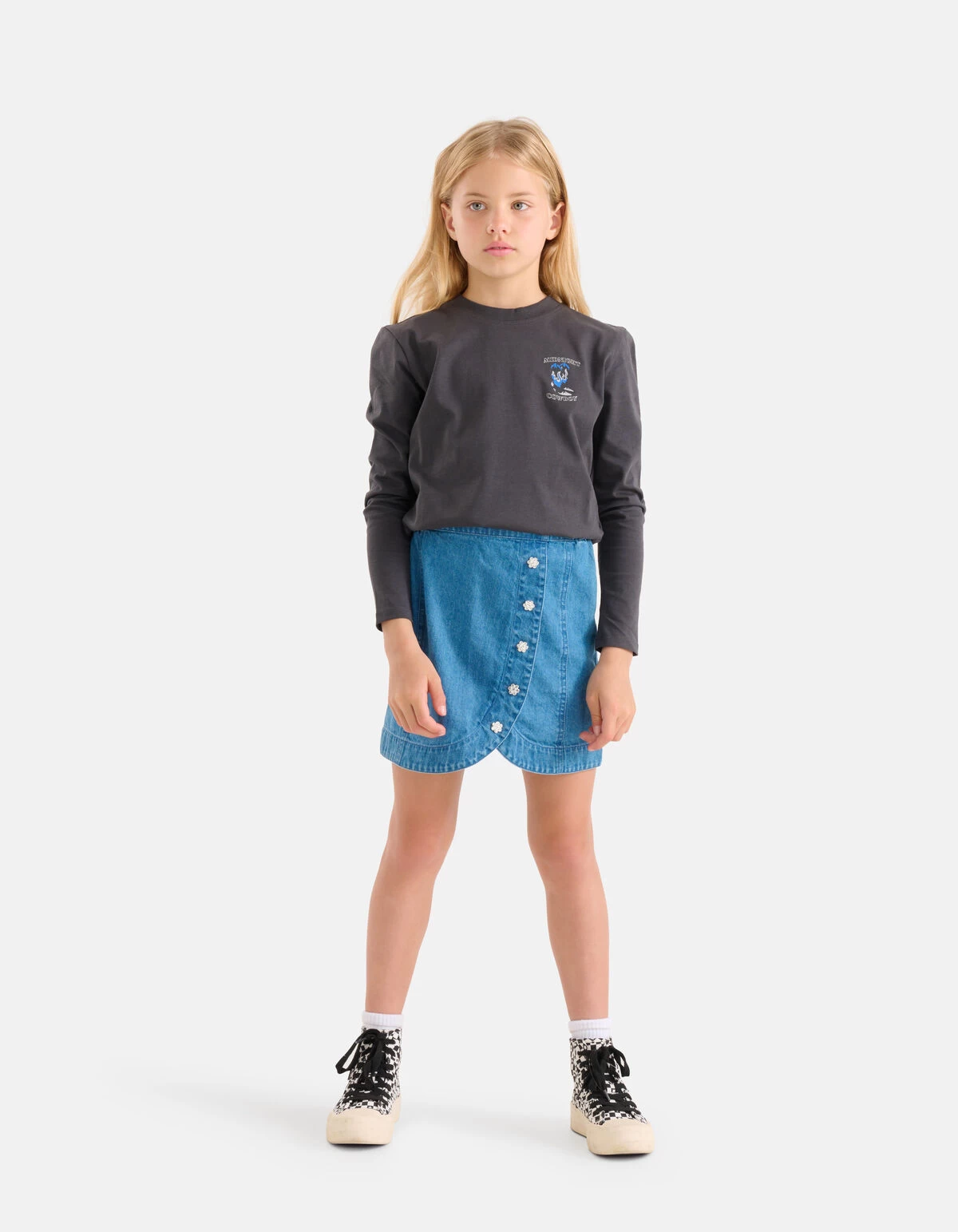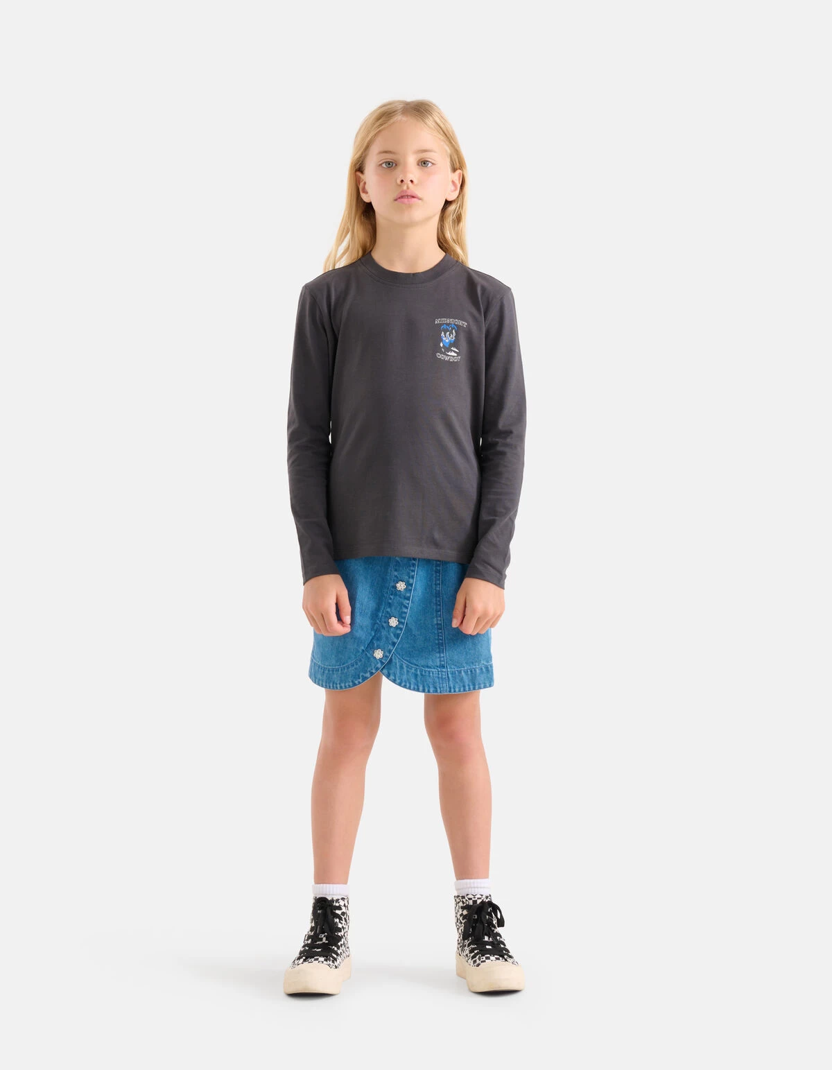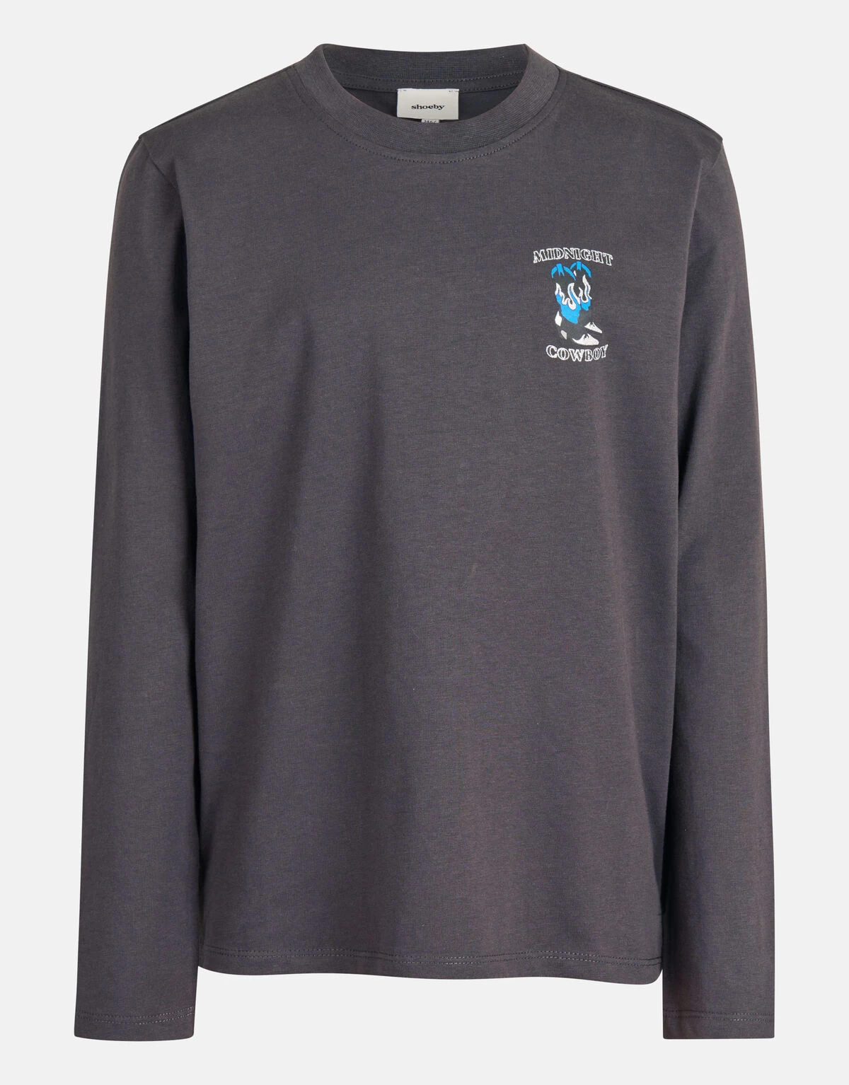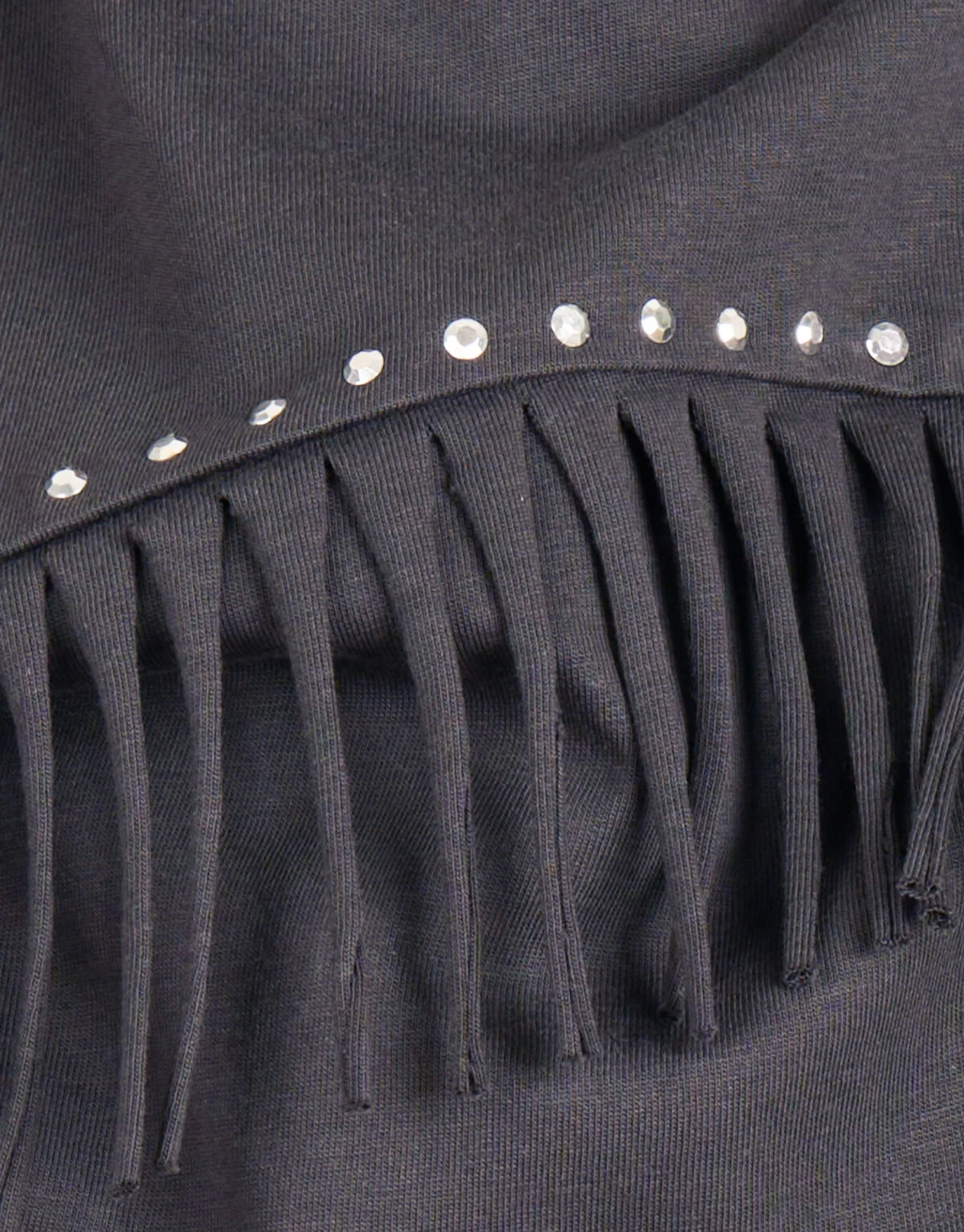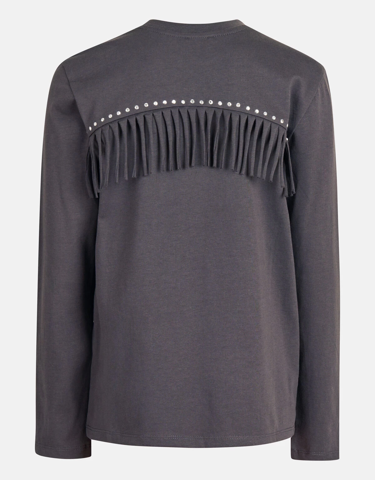 Saddle boots, denim, and fringe galore! Het Fringe Longsleeve T-shirt heeft een lange mouw, een hoge ronde hals, een stretch stof en een regular fit. Het item wordt gekenmerkt door de donkergrijze kleur met een subtiel western artwork op de voorzijde. Een leuk detail zijn de fringes op de achterzijde met zilveren studs. Get ready to rodeo with Shoeby’s western-inspired fashion for girls! Het t-shirt is gemaakt van 100% katoen, hierdoor is het sterk van kwaliteit en draagt het comfortabel. Maak de look compleet met een denim rok en een paar sneakers voor een fashionable look!