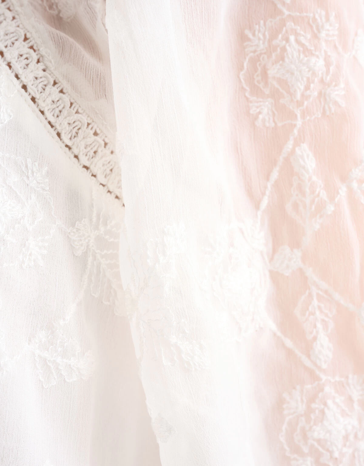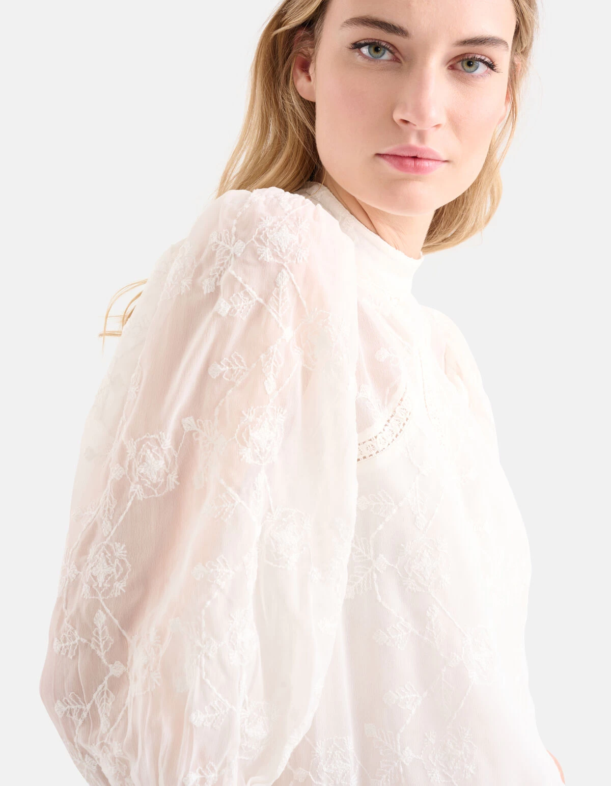 One of a kind! De Geborduurde Tape Top heeft driekwart mouwen, een hoge ronde hals, een knoopsluiting op de achterzijde en een regular fit. Het item wordt gekenmerkt door een gebroken witte kleur en een transparante stof. De voor-en achterzijde van de top hebben een dubbele laag, waardoor deze niet doorschijnt. Een leuk detail aan de top zijn de geborduurde details met tape inzetstukken. Het is gemaakt van 100% polyester, hierdoor is het sterk van kwaliteit en vormvast. Combineer het samen met een jeans voor een casual look! Het model heeft een lengte van 177 cm en draagt maat S. Het artikel heeft een totale lengte van 64,5 cm bij maat S.