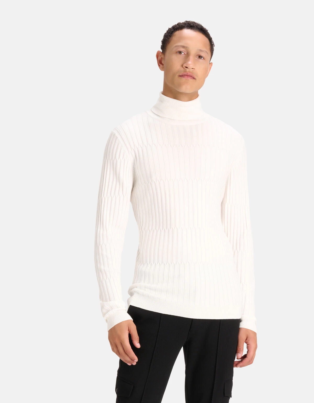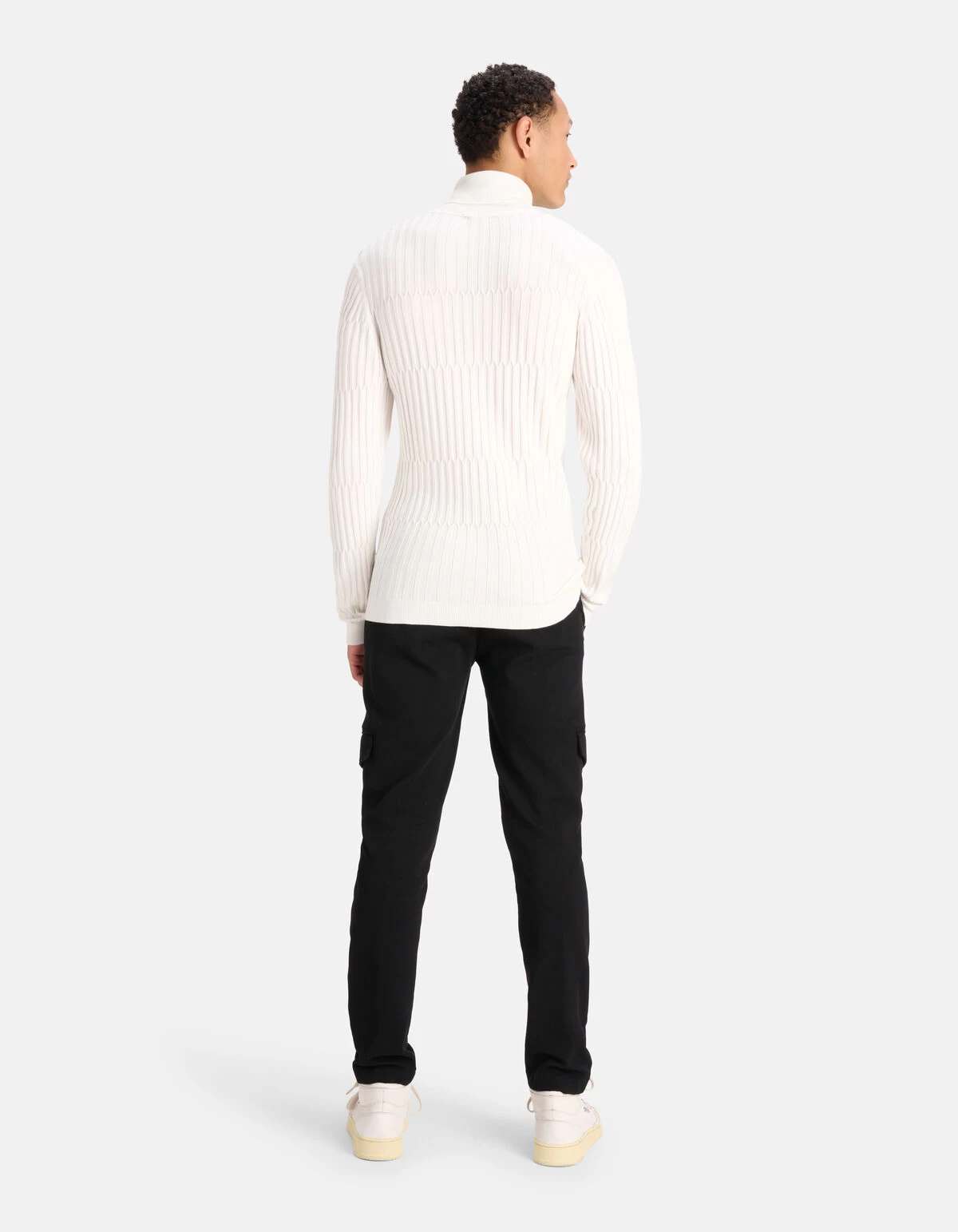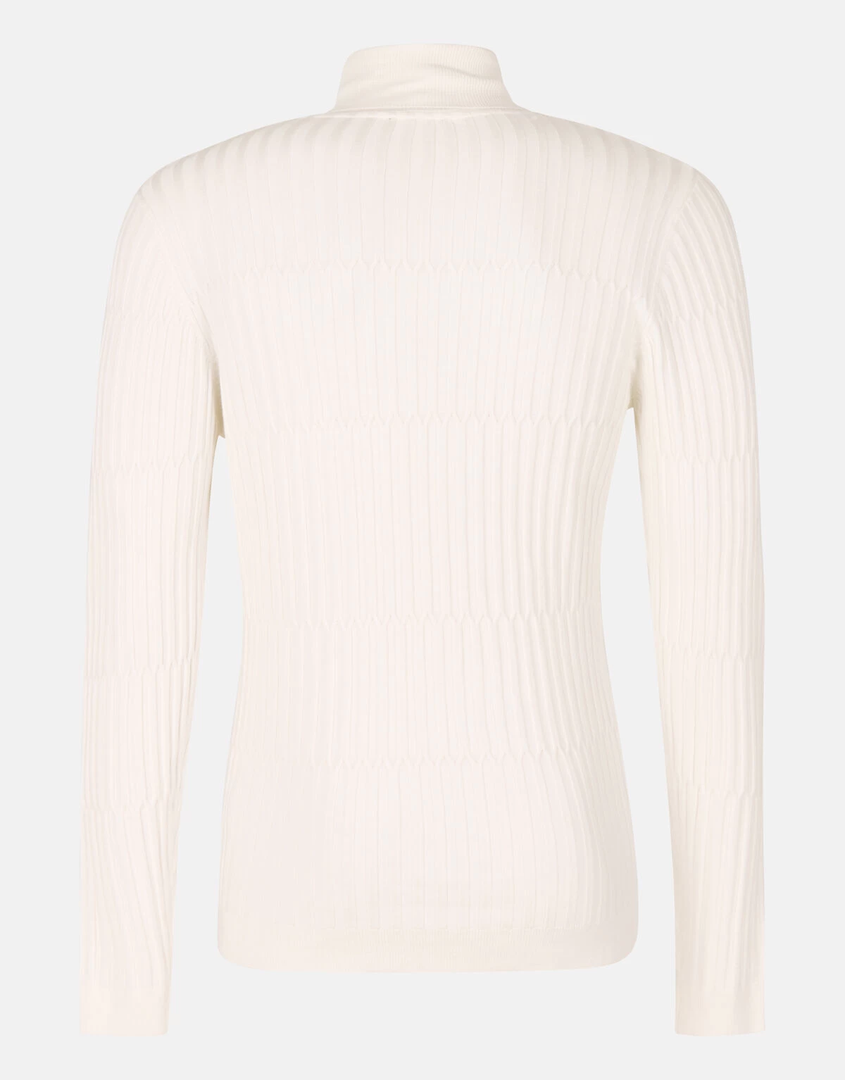 De Gestreepte Coltrui is de perfecte toevoeging aan jouw wintergarderobe! Het item heeft lange mouwen, een hoge opgerolde kraag en een regular fit. Het item wordt gekenmerkt door de witte kleur met een all-over strepen design, dit geeft net een unieke look. Verder is het gemaakt van viscose en nylon, waardoor het een luxueuze uitstraling heeft, fijn draagt, vormvast blijft en niet kreukt. Combineer het samen met een nette pantalon en je bent good to go. Het model heeft een lengte van 189 cm en draagt maat M. Het artikel heeft een totale lengte van 83,5 cm bij maat M.