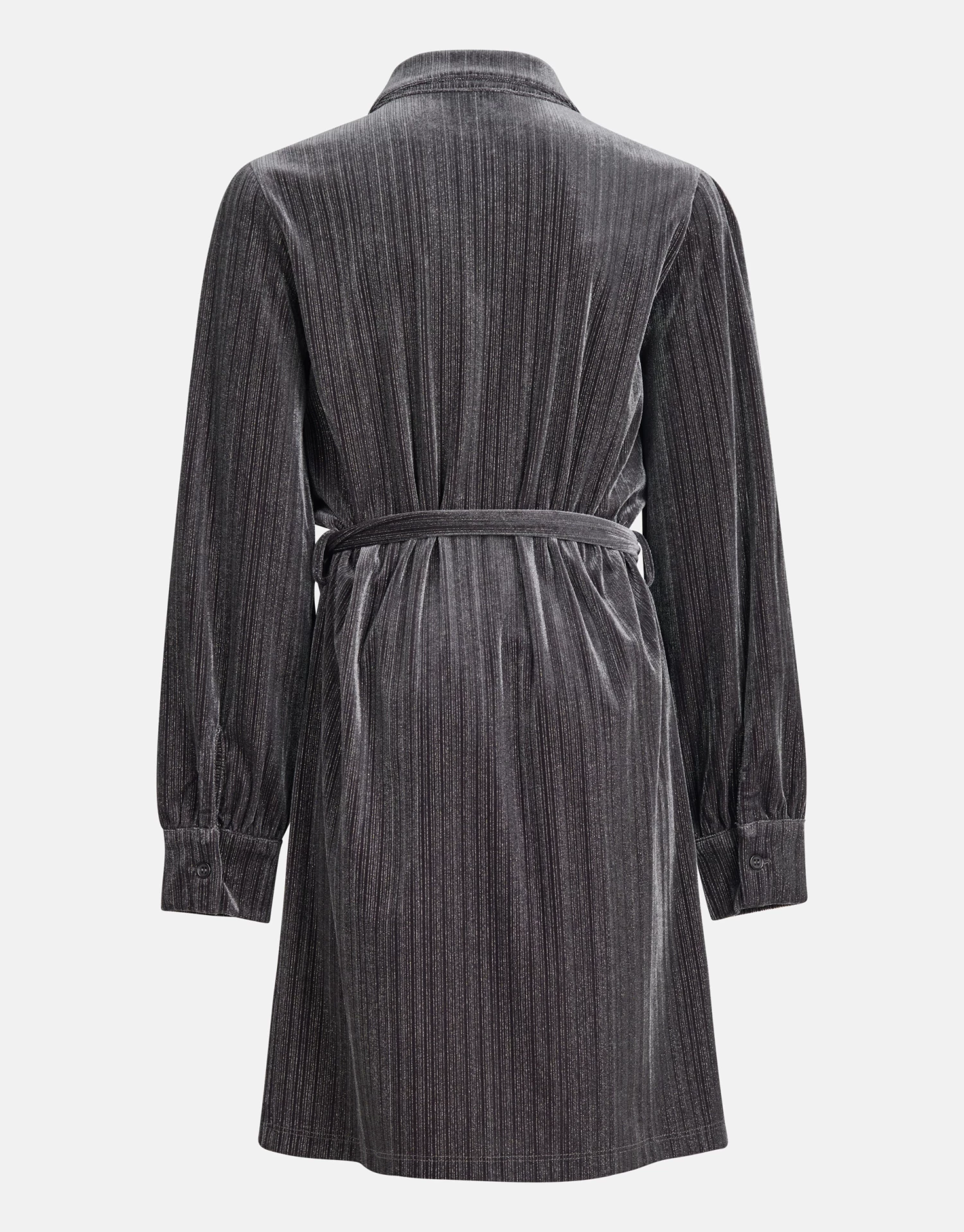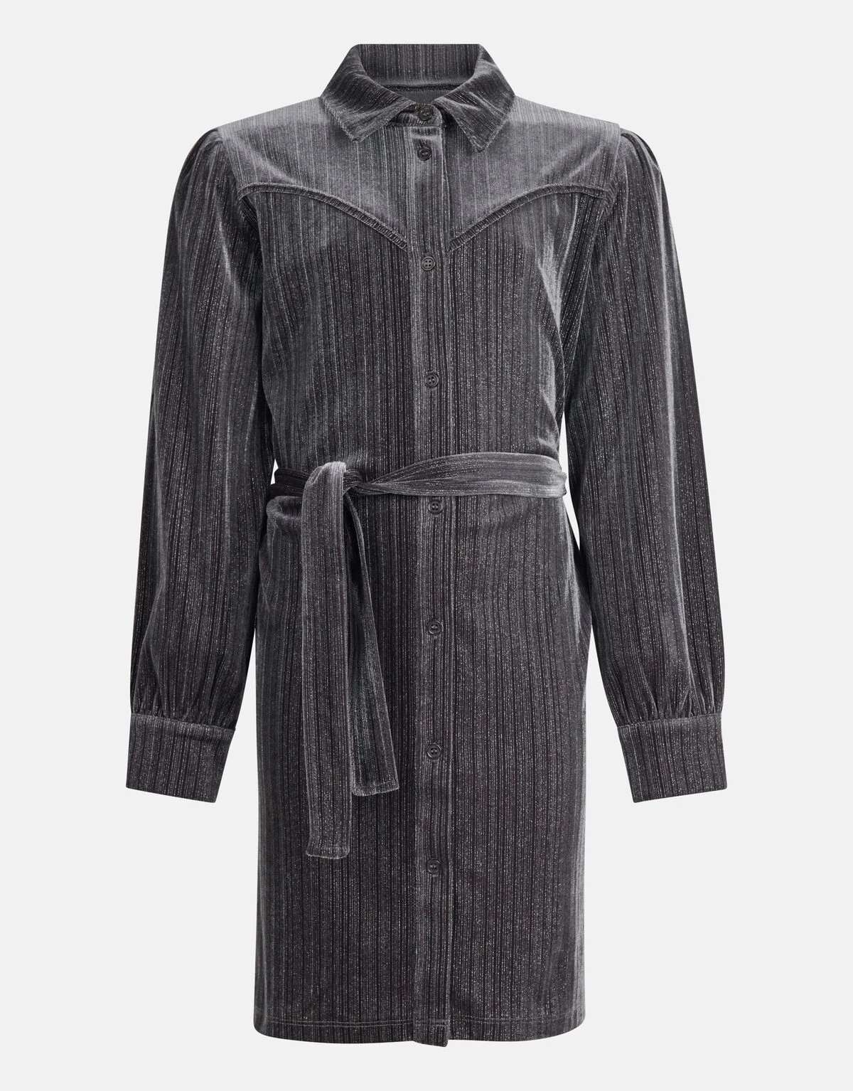Sparkling styles spotted! De Glitter Jurk heeft lange mouwen, een stretch stof, een kraag, een knoopsluiting en een wijd uitlopend model. Het item wordt gekenmerkt door de velvet stof, de donkergrijze kleur met all-over zilveren lurexdraad door de stof heen geweven. Verder heeft de jurk een ceintuur voor in de taille, zodat de jurk meer vorm kan geven. Het is gemaakt van polyester, metallic en elastaan. Door deze samenstelling is het sterk van kwaliteit, vormvast en subtiel rekbaar. Maak de look compleet met een paar stoere boots en je bent ready to go!
