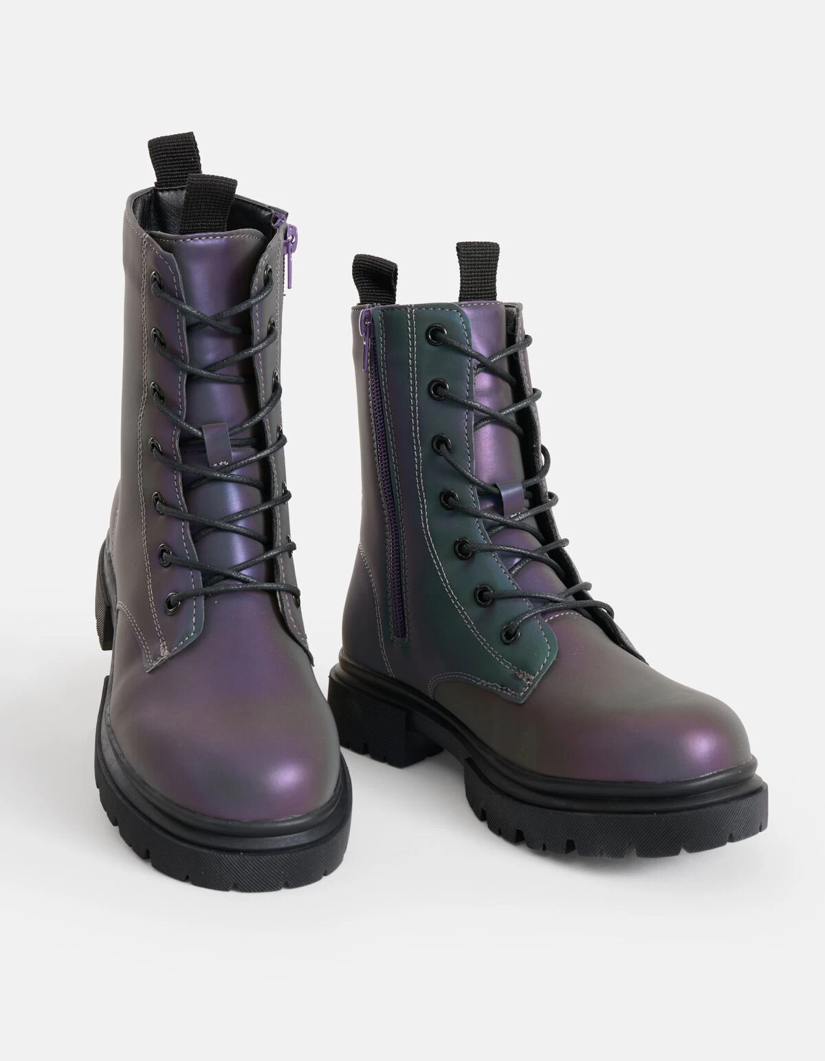 Een stoere boot voor een stoere meid! De Hologram Laars wordt gekenmerkt door de zwarte kleur met een hologram effect. Het effect heeft een paarse en blauwe kleur. Verder heeft de laars een ritssluiting en zit er een treklus aan de voor-en achterzijde. Zo kan je de laarzen makkelijk aan en uit trekken. De chunky zool heeft een totale hoogte van 3,5 cm.