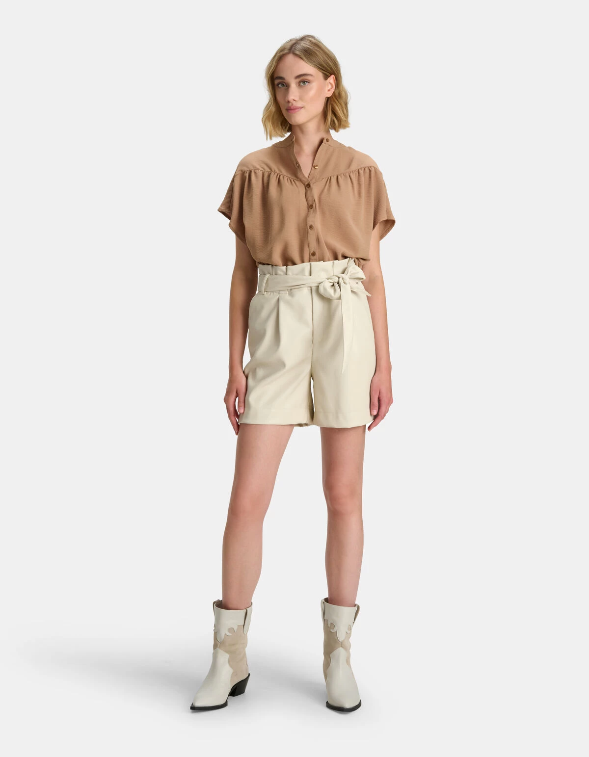 The perfect top! De Jazzy Top heeft een korte mouw, een hoge hals, een knoopsluiting en een relaxed fit. Het item wordt gekenmerkt door een bruine kleur en een fijne luchtige stof. Combineer de top samen met eeen vegan leren short en laarzen voor een stijlvolle look. Het model heeft een lengte van 179 cm en draagt maat S. Het artikel heeft een totale lengte van 68 cm bij maat S.