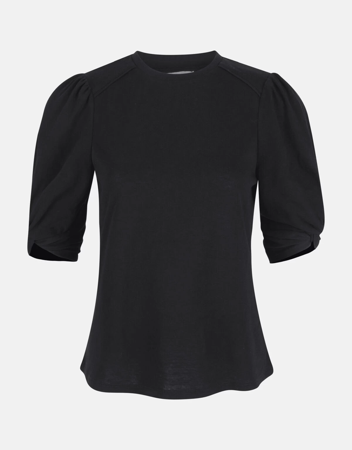 Black is always a good idea! Het Knot T-shirt heeft een korte mouw, een hoge ronde hals en een regular fit. Het item wordt gekenmerkt door de zwarte kleur en heeft knoop details op de mouwen. Verder is het t-shirt gemaakt van polyester en katoen. Door deze samenstelling is het sterk van kwaliteit, vormvast en draagt het comfortabel. Maak de look compleet met een beige short en chunky loafers voor een edgy look! Het model heeft een lengte van 173 cm en draagt maat S. Het artikel heeft een totale lengte van 58,5 cm bij maat S.