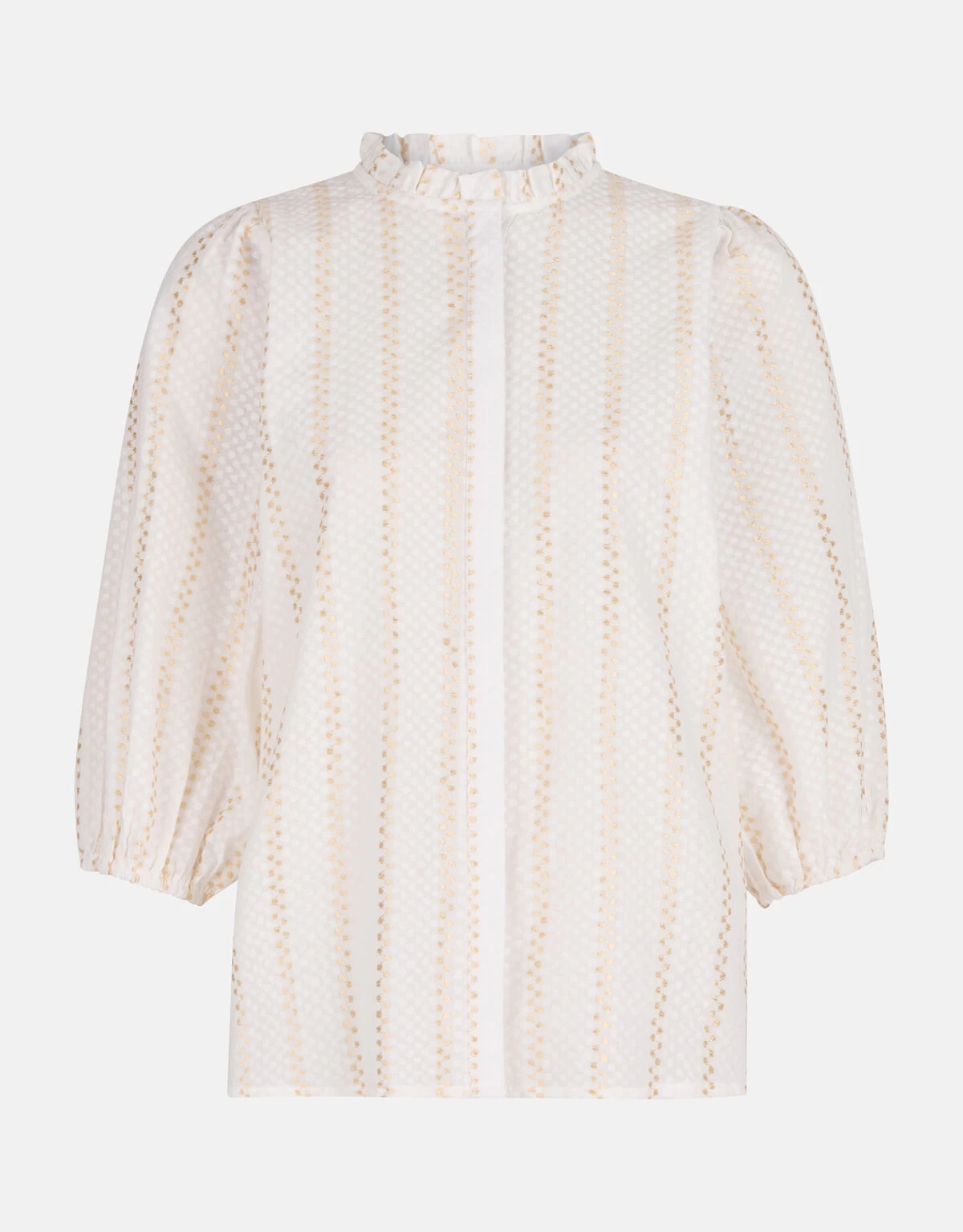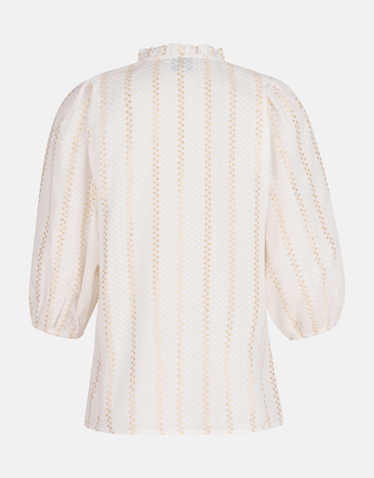 Golden eyecatcher! De Lurex Detail Blouse heeft driekwart pofmouwen, een hoge hals, een knoopsluiting en een relaxed fit. Het item wordt gekenmerkt door een gebroken witte kleur met een motiefje van all-over lurexdraden in de stof. De lurexdraden hebben een gouden en een witte kleur. Het is gemaakt van 100% katoen waardoor het sterk van kwaliteit is en fijn draagt. Maak de look af met een basis top voor eronder, een bruine pantalon en chunky sneakers voor een casual chic look! Het model heeft een lengte van 173 cm en draagt maat S. Het artikel heeft een totale lengte van 62 cm bij maat S.