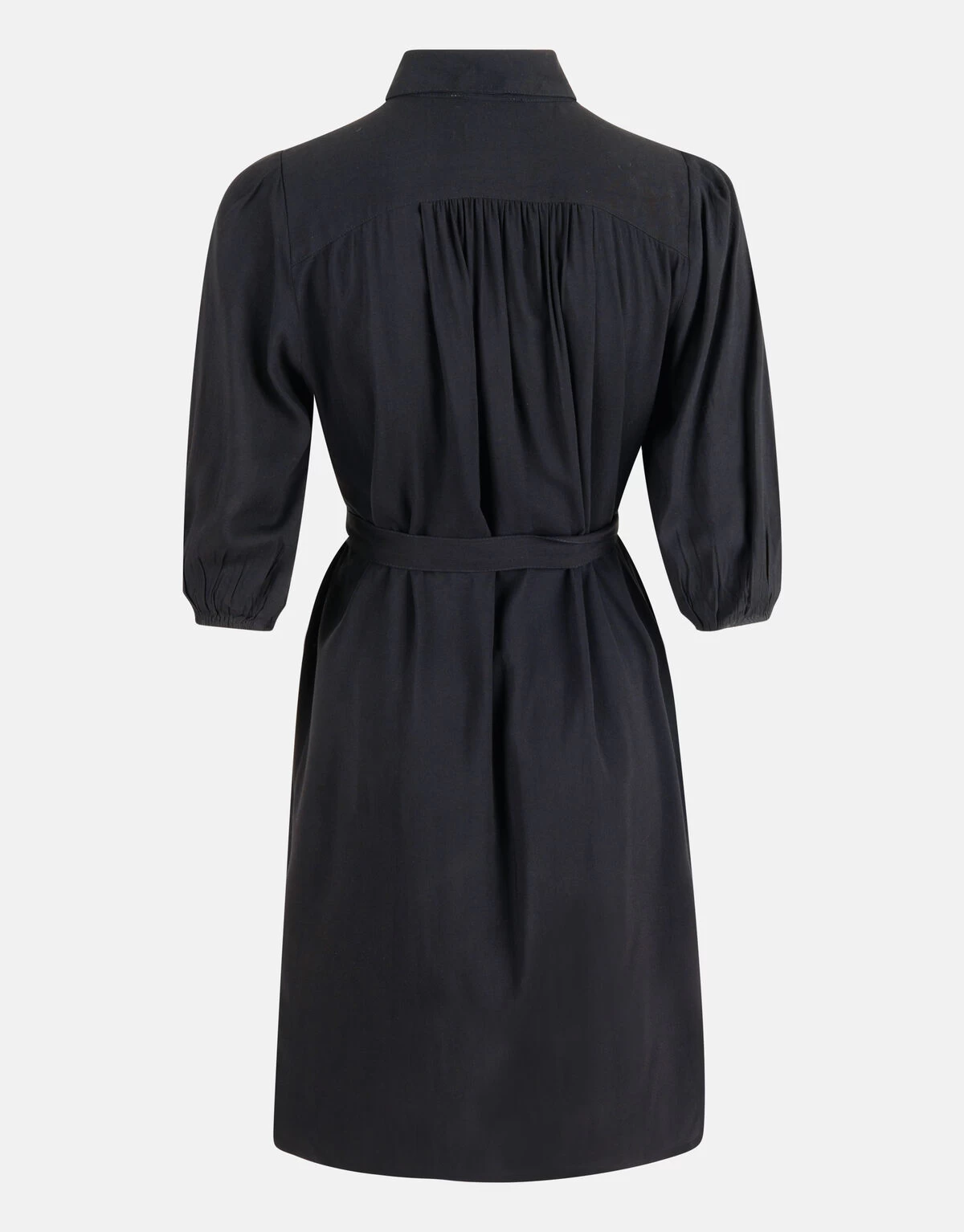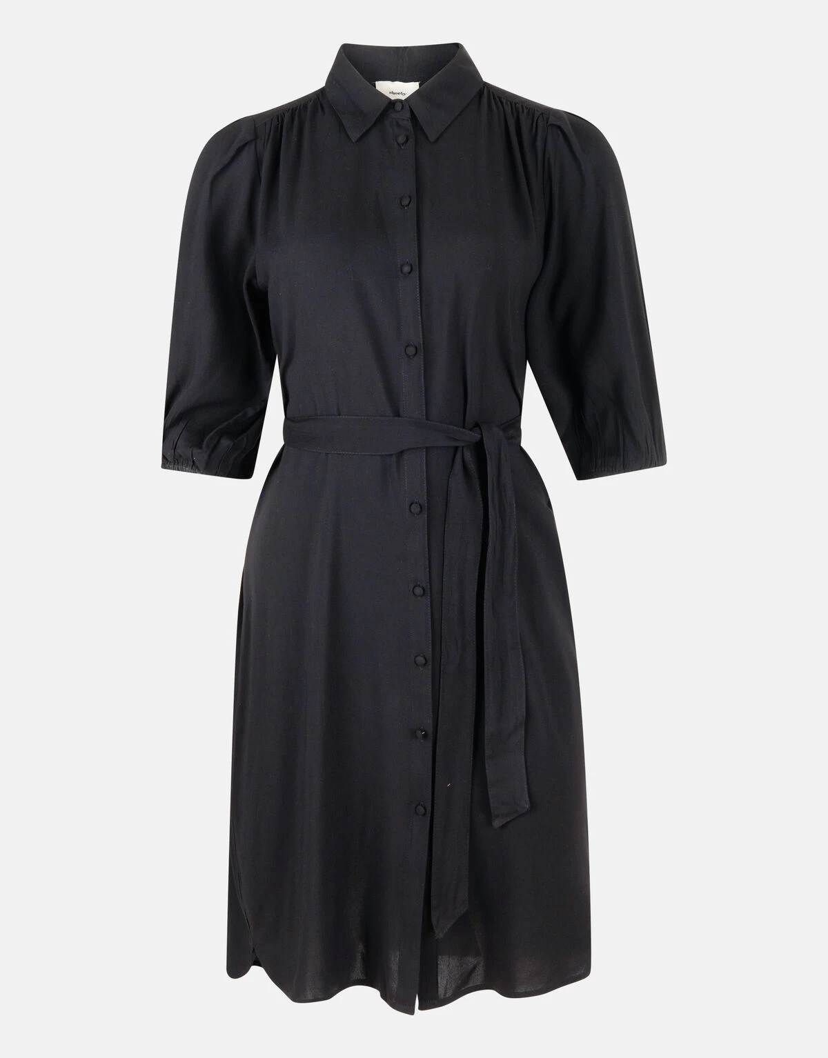 Perfect in black! De Midi Jurk heeft driekwart mouwen, een kraag, een knoopsluiting, een midi-lengte en een regular fit. Het item wordt gekenmerkt door de zwarte kleur met een bijpassend ceintuur. Verder hebben de mouwen een elastieke band, waardoor er een pof mouw onstaat. Het is gemaakt van 100% viscose hierdoor draagt het comfortabel en is het vormvast. De viscose is afkomstig uit duurzaam beheerde bossen, conform de duurzaamheidscriteria van FSC®. Maak de look compleet met een paar stoere laarzen en je bent ready to go! Het model heeft een lengte van 179 cm en draagt maat S. Het artikel heeft een totale lengte van 103,5 cm bij maat S.