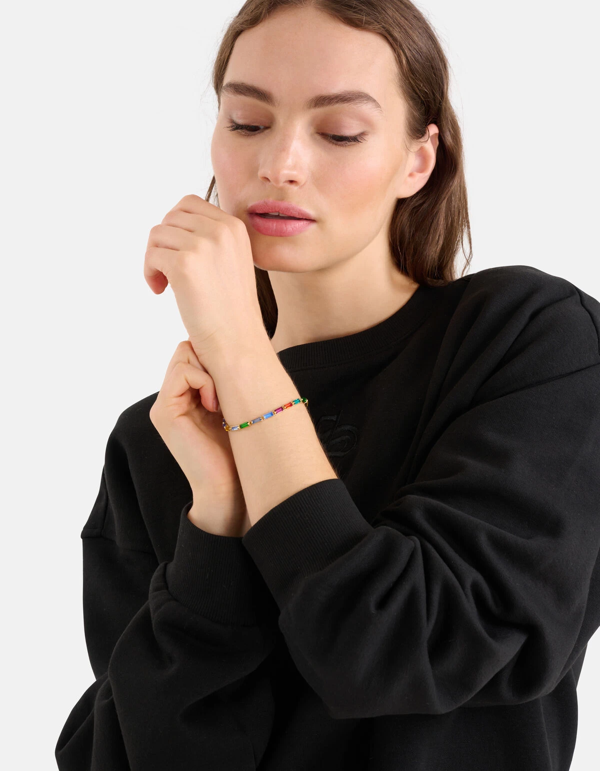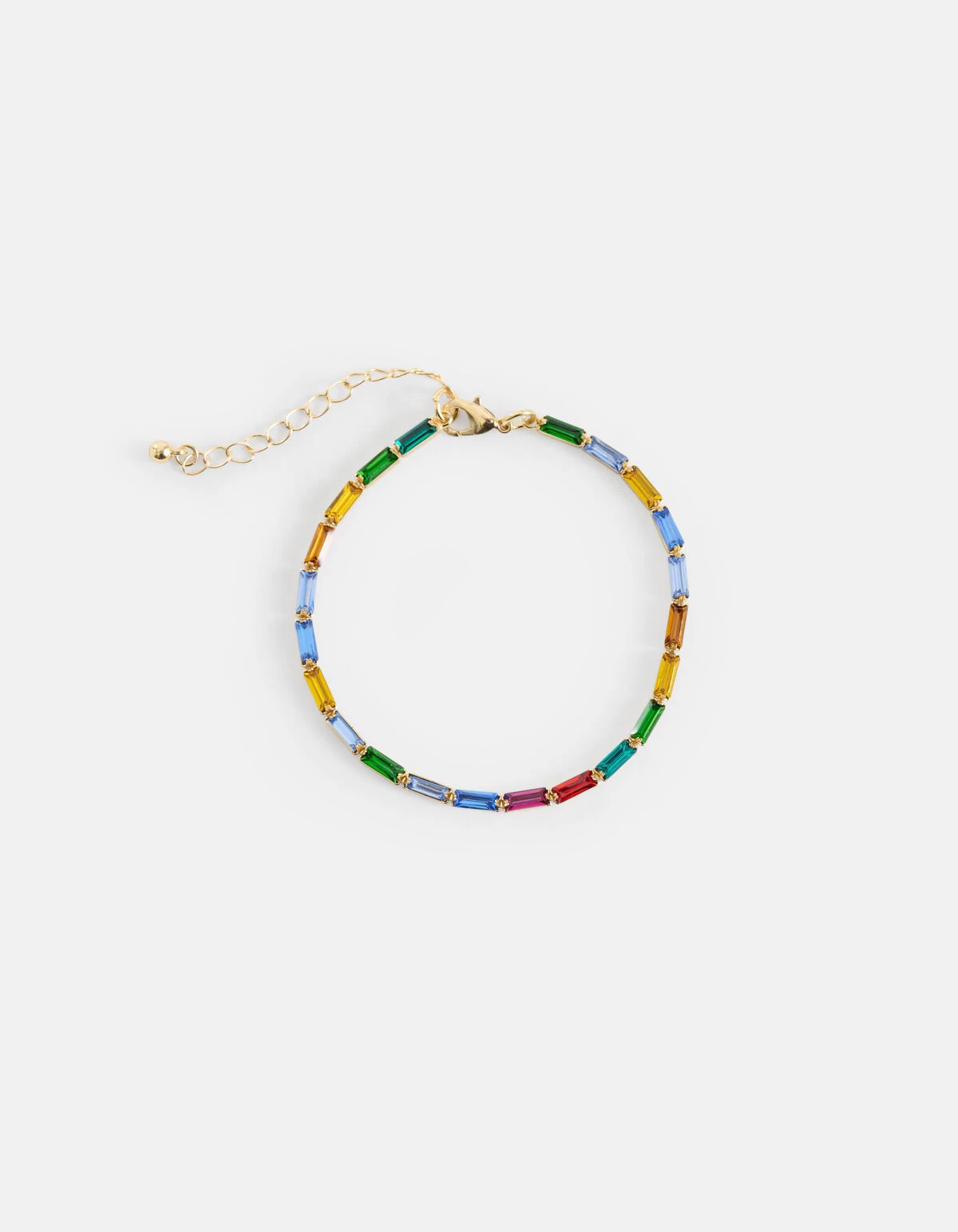 Unleash your bold and passionate style! De Multi Strass Armband is het perfecte statement artikel dat bij elke outfit past. De armband wordt gekenmerkt door de gouden kleur met all-over strass steentjes in de kleuren van de regenboog. De strass stenen hebben een rechthoekige vorm en geven een extra spark aan je outfit. Designed to make you shine! Verder heeft het een haaksluiting, waardoor het makkelijk is om de armband te sluiten. Combineer het samen met de bijpassende multi strass ketting voor de complete set!