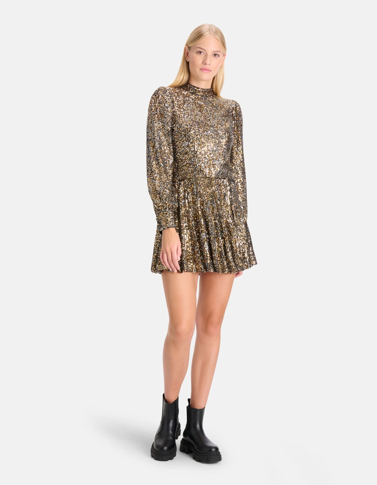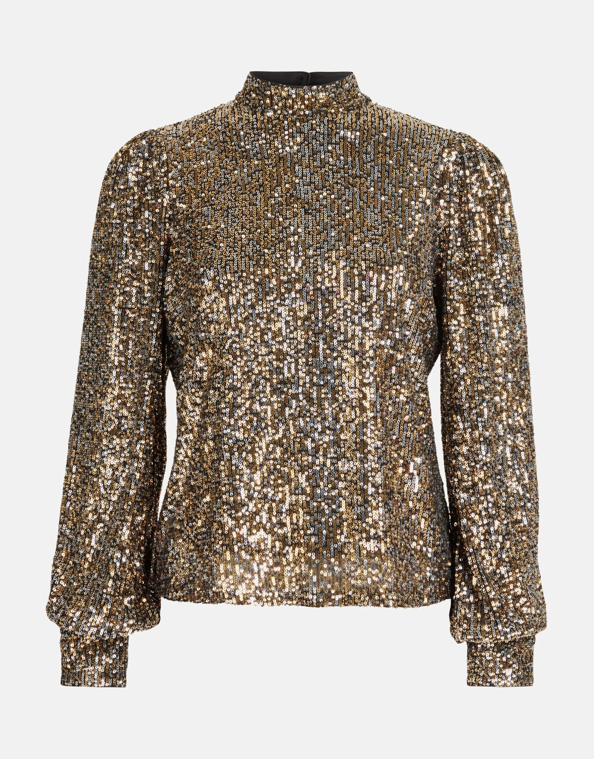 De Pailletten Top heeft lange uitlopende mouwen, een hoge hals, een knoopsluiting op de achterzijde en een regular fit. Het item wordt gekenmerkt door de all-over pailletten glitters in de kleur goud en zilver. Je hoeft niet bang te zijn dat de pailletten kriebelen. De top heeft een dikke voering aan de binnenkant, zodat je de pailletten niet voelt. Verder heeft de top nog manchetten aan de onderzijde van de mouwen, hierdoor krijgen de mouwen een extra pof effect. Maak de look compleet met de bijpassende rok. Het model heeft een lengte van 182 cm en draagt maat S. Het artikel heeft een totale lengte van 57,5 cm bij maat S. Glittery styles for the win!