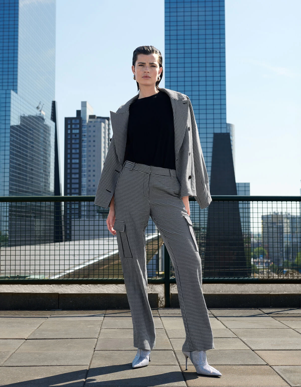 Unleash your urban vibe met de de Pied-De-Poule Cargo Broek! De broek heeft een hoge taille, een non-stretch stof, insteekzakken, paspelzakken, een knoop-en ritssluiting en een straight fit met een wide leg. Het item wordt gekenmerkt door de witte kleur met een all-over pied-de-poule print in het zwart. Een stoer detail zijn de 3D cargo zakken op de zijkant, deze zijn open-en dicht te maken via een drukknoop. Laat jezelf opvallen met de tijdloze print van pied de poule! Het is gemaakt van polyester en elastaan. Door deze samenstelling is het vormvast, sterk van kwaliteit en comfortabel. Maak de look compleet met een oversized t-shirt, een pied-de-poule blazer en je bent ready to go! Het model heeft een lengte van 174 cm en draagt maat S. Het artikel heeft een binnenbeenlengte van 82 cm bij maat S.