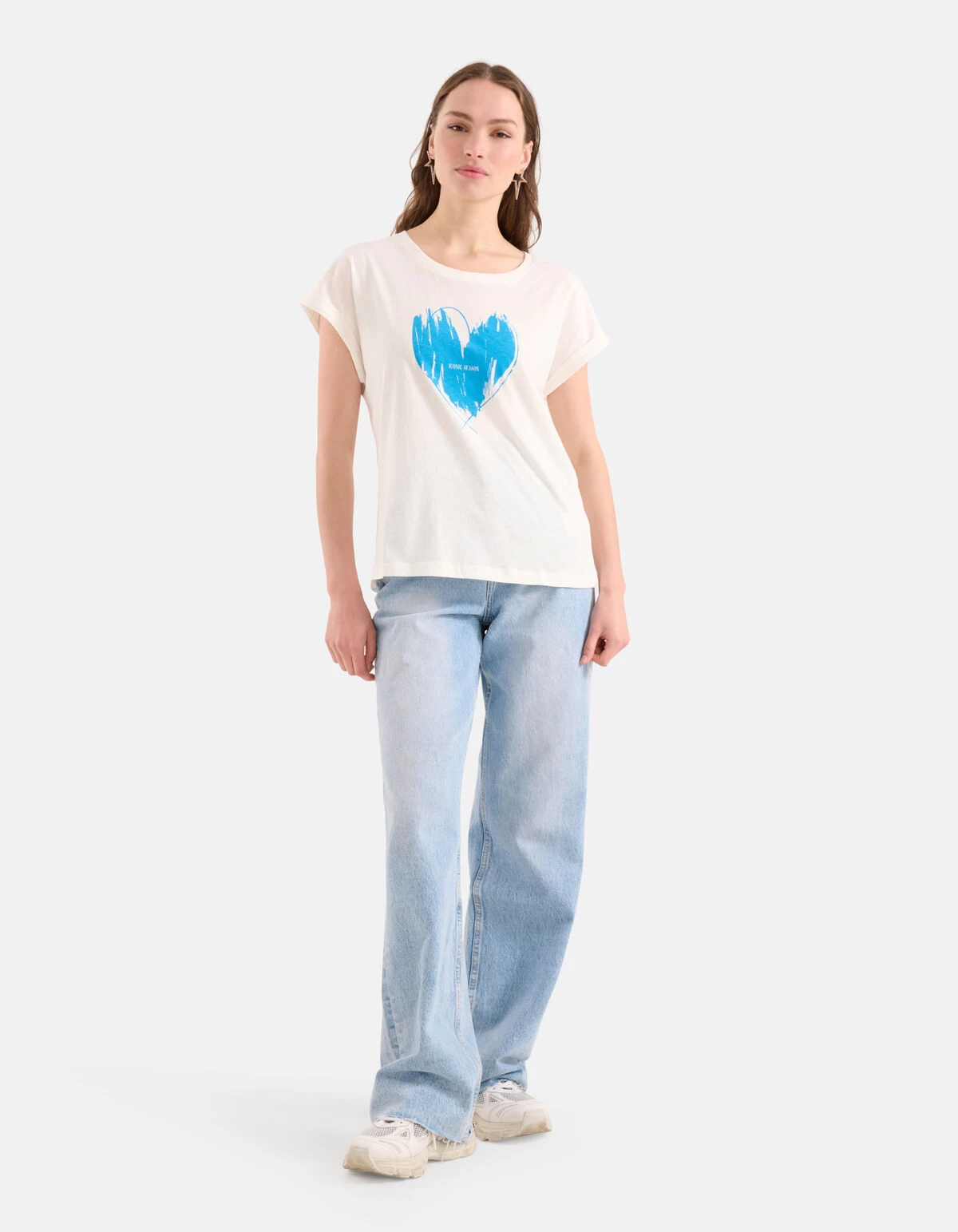 Vacation mode: On! Het Print T-shirt heeft een korte mouw, een hoge ronde hals en een relaxed fit. Het item wordt gekenmerkt door de gebroken witte kleur met een blauw artwork op de voorzijde. Het artwork heeft de vorm van een hart met de tekst: ”iconic season”. Het is gemaakt van 100% katoen, hierdoor draagt het comfortabel en is het sterk van kwaliteit. Maak de look compleet met een wide leg jeans en een paar chunky sneakers voor een stijlvolle look! Het model heeft een lengte van 173 cm en draagt maat S. Het artikel heeft een totale lengte van 60 cm bij maat S.