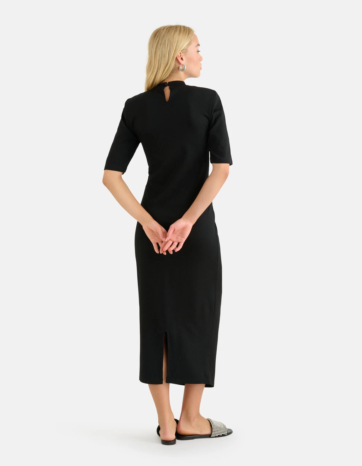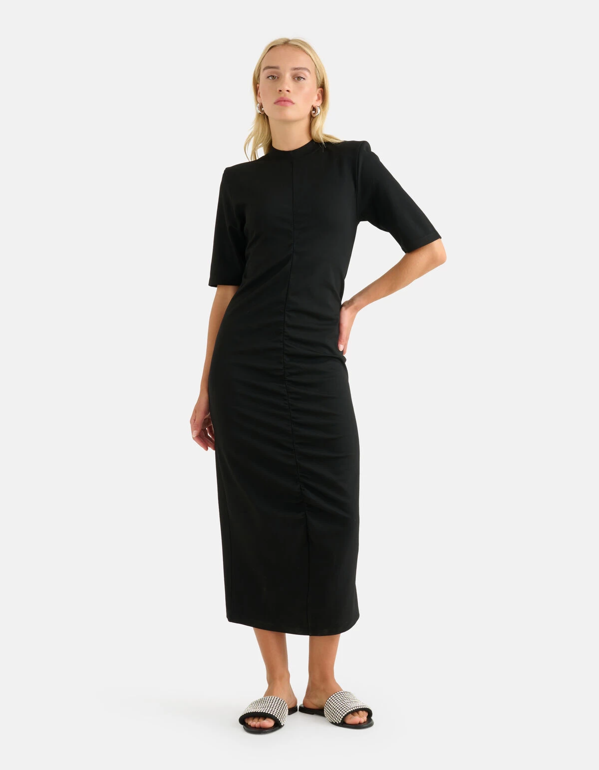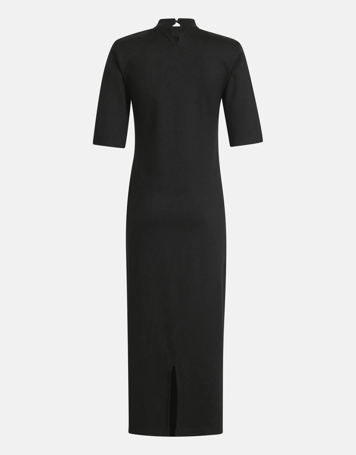 Be fearless in our trendy Punta Plooien Jurk! De jurk heeft een driekwart mouw, een maxi-lengte, een hoge ronde hals, een knoopsluiting op de achterzijde, een stretch stof en uitneembare schoudervullingen. Het item wordt gekenmerkt door de zwarte kleur met een elastieke plooi aan de voorkant. Een leuk detail is de split aan de achterzijde! De jurk is gemaakt van een punta stof, hierdoor is het gemaakt van een heavy jersey waardoor het perfect voor het najaar is. Het is gemaakt van polyester en elastaan. Door deze samenstelling is het sterk van kwaliteit, strijkvrij, vormvast, stretchy en draagt het comfortabel. Maak de look compleet met een paar sandalen voor een sophisticated look! Het model heeft een lengte van 172 cm en draagt maat S. Het artikel heeft een totale lengte van 120 cm bij maat S.