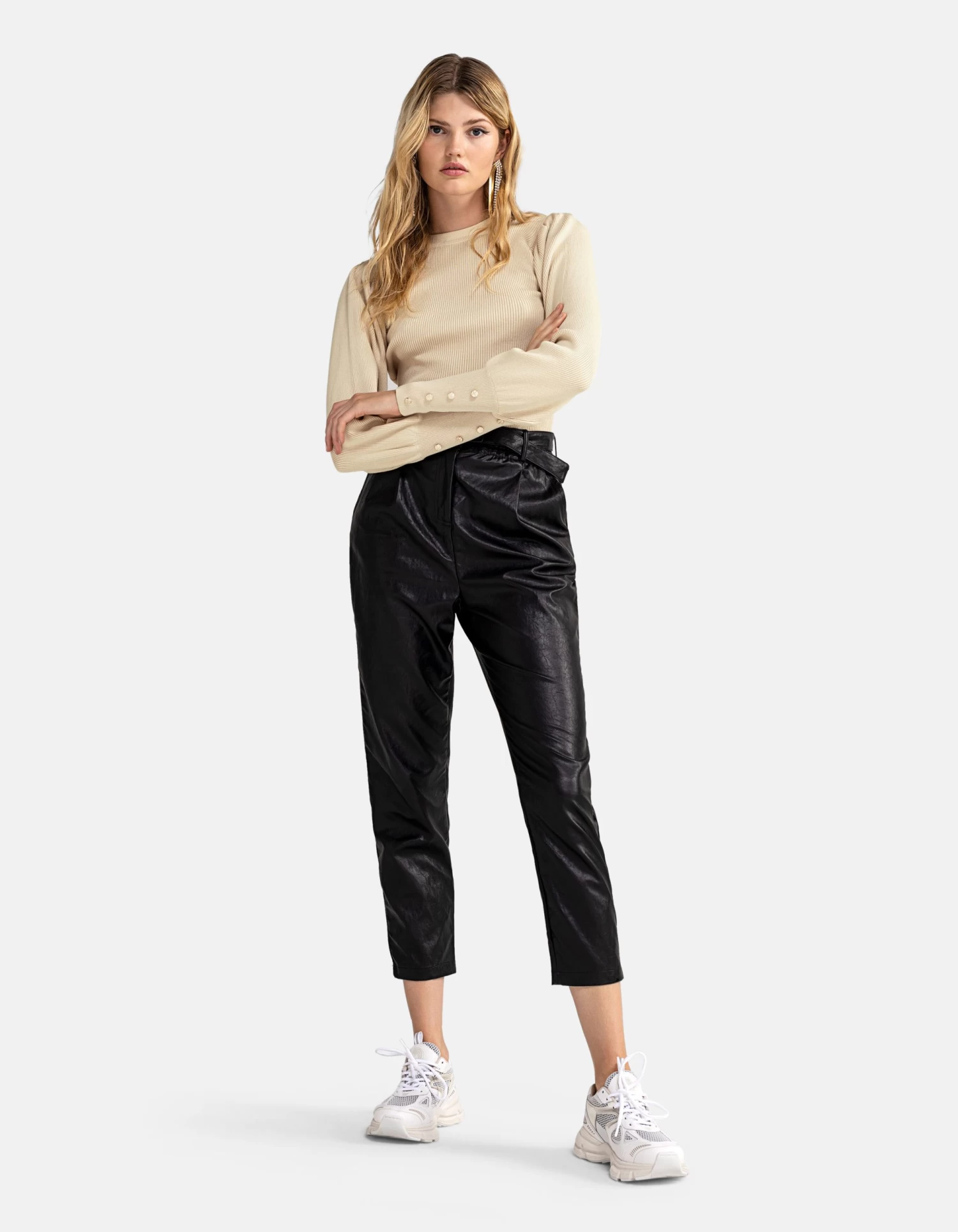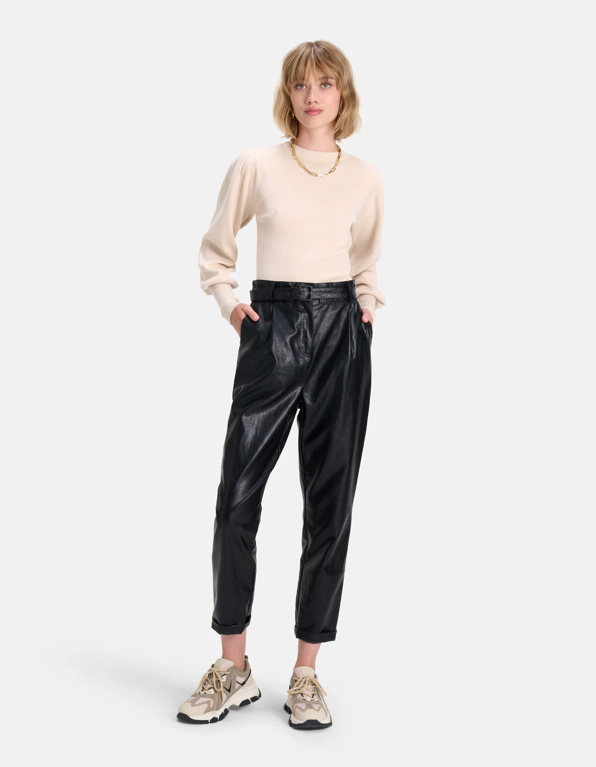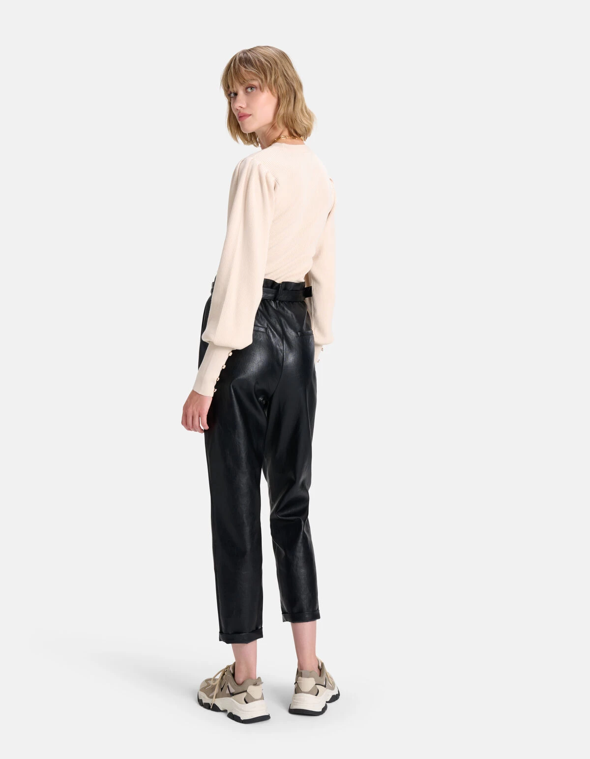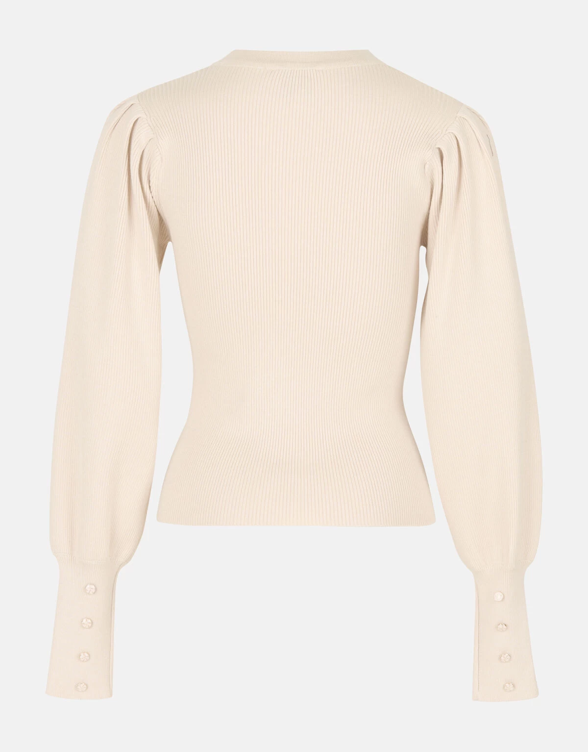 The perfect basic! De Rib Trui heeft lange pofmouwen, een ronde hals en een aansluitende fit. Het item wordt gekenmerkt door de beige kleur en een rib detail in de stof. Verder hebben de mouwen elastiek aan de onderzijde met vier decoratieve knopen. Het is gemaakt van viscose en nylon, waardoor het item fijn draagt, kleurvast en sterk van kwaliteit is. Combineer het samen met een vegan leren broek en een chunky sneaker voor een stijlvolle look. Het model heeft een lengte van 179 cm en draagt maat S. Het artikel heeft een totale lengte van 54 cm bij maat S.