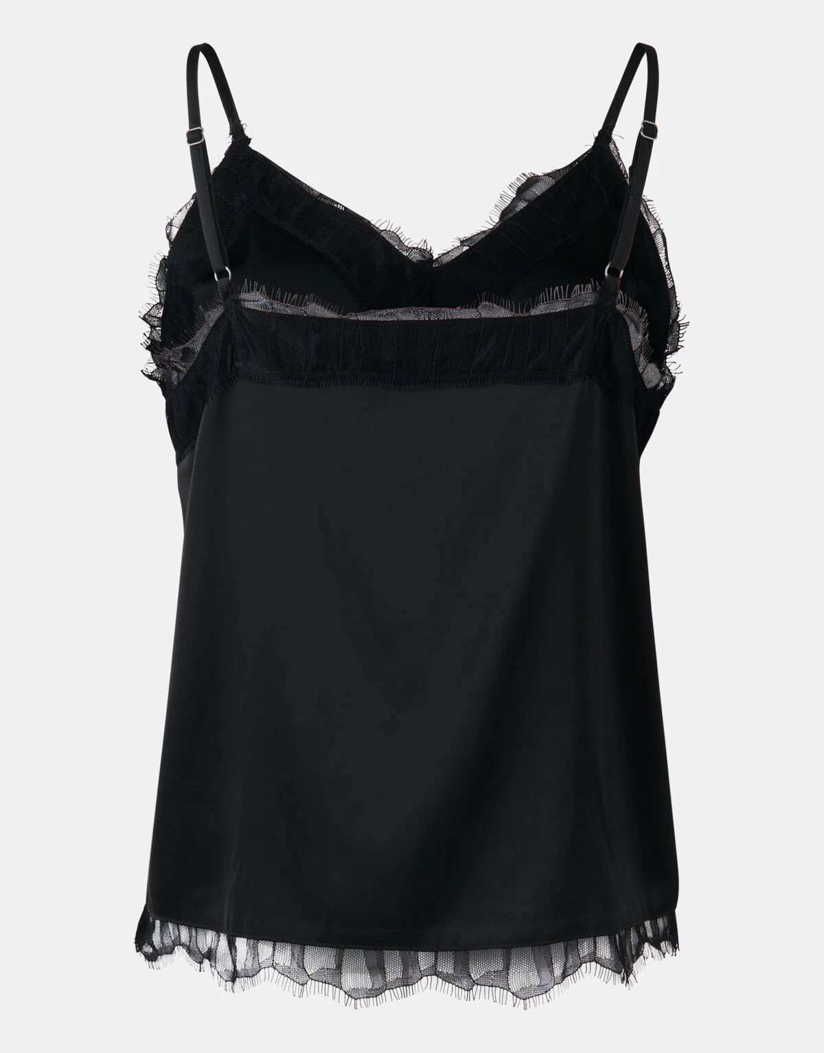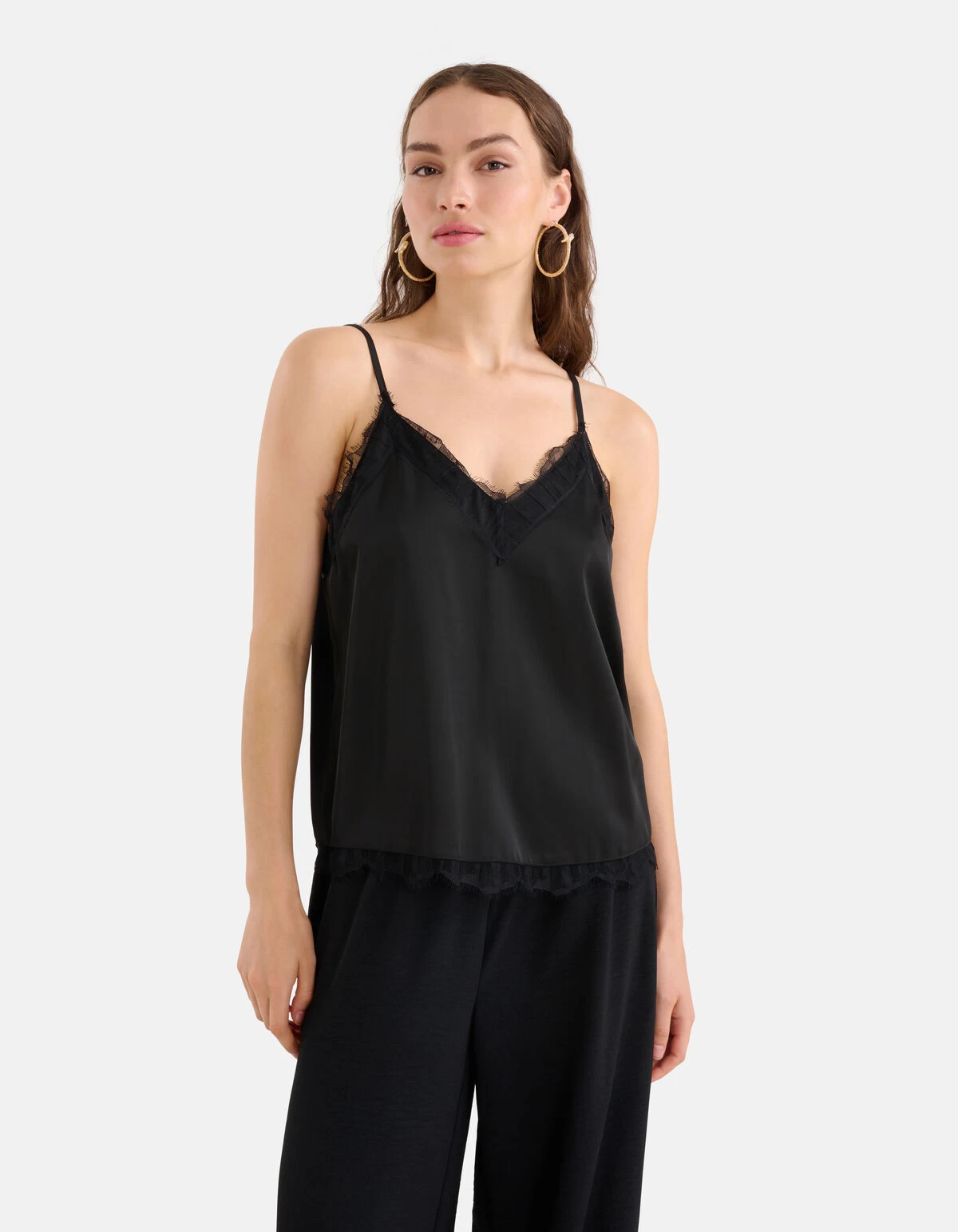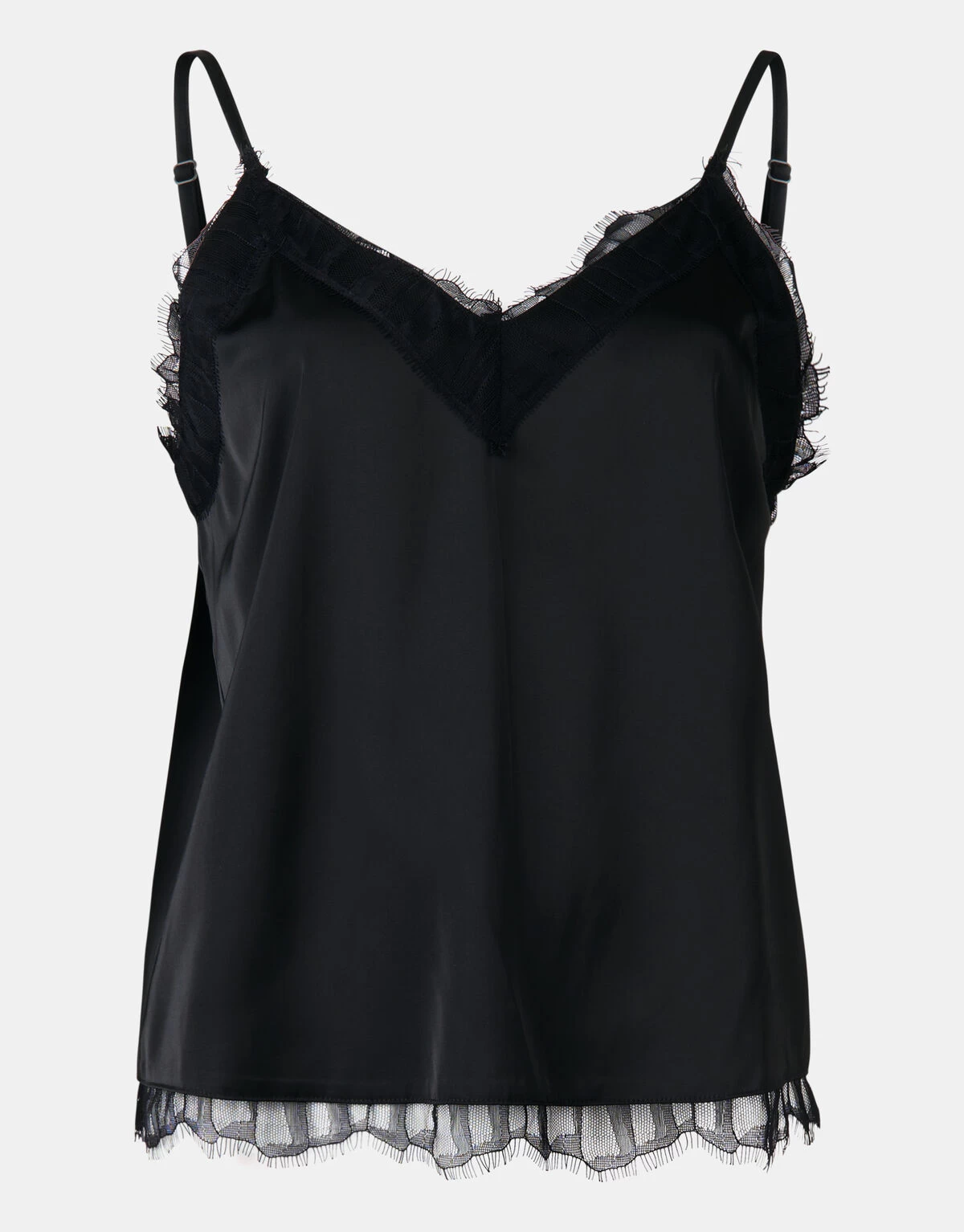 De Satijnen Lace Top is de perfecte toevoeging aan jouw garderobe! Het item wordt gekenmerkt door een regular fit, een v-hals, verstelbare spaghettibandjes en een glanzende stof met het gevoel van satijn. Verder heeft de top een zwarte kleur met kant bij de v-hals en aan de onderzijde. De top is gemaakt van polyester en viscose. Door deze samenstelling is het sterk van kwaliteit, vormvast, kleurvast en draagt het comfortabel. Combineer de top samen met een zwarte pantalon voor een sophisticated look! Het model heeft een lengte van 173 cm bij maat S. Het artikel heeft een totale lengte van 36 cm bij maat S.