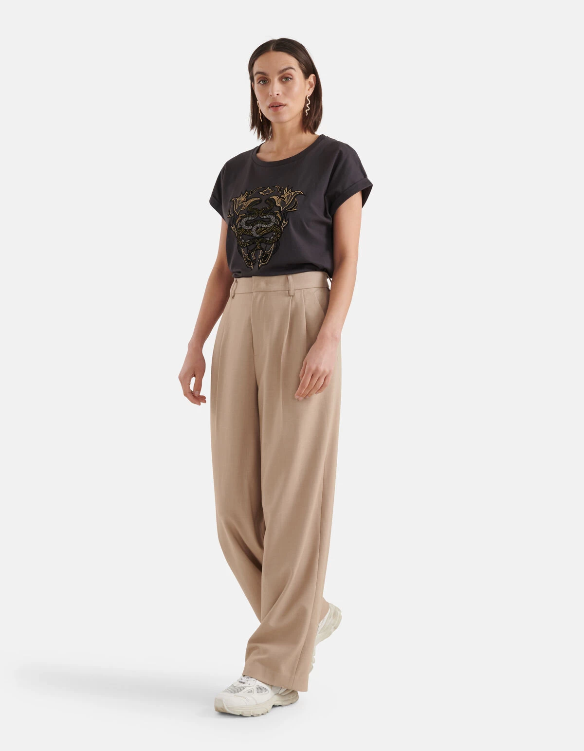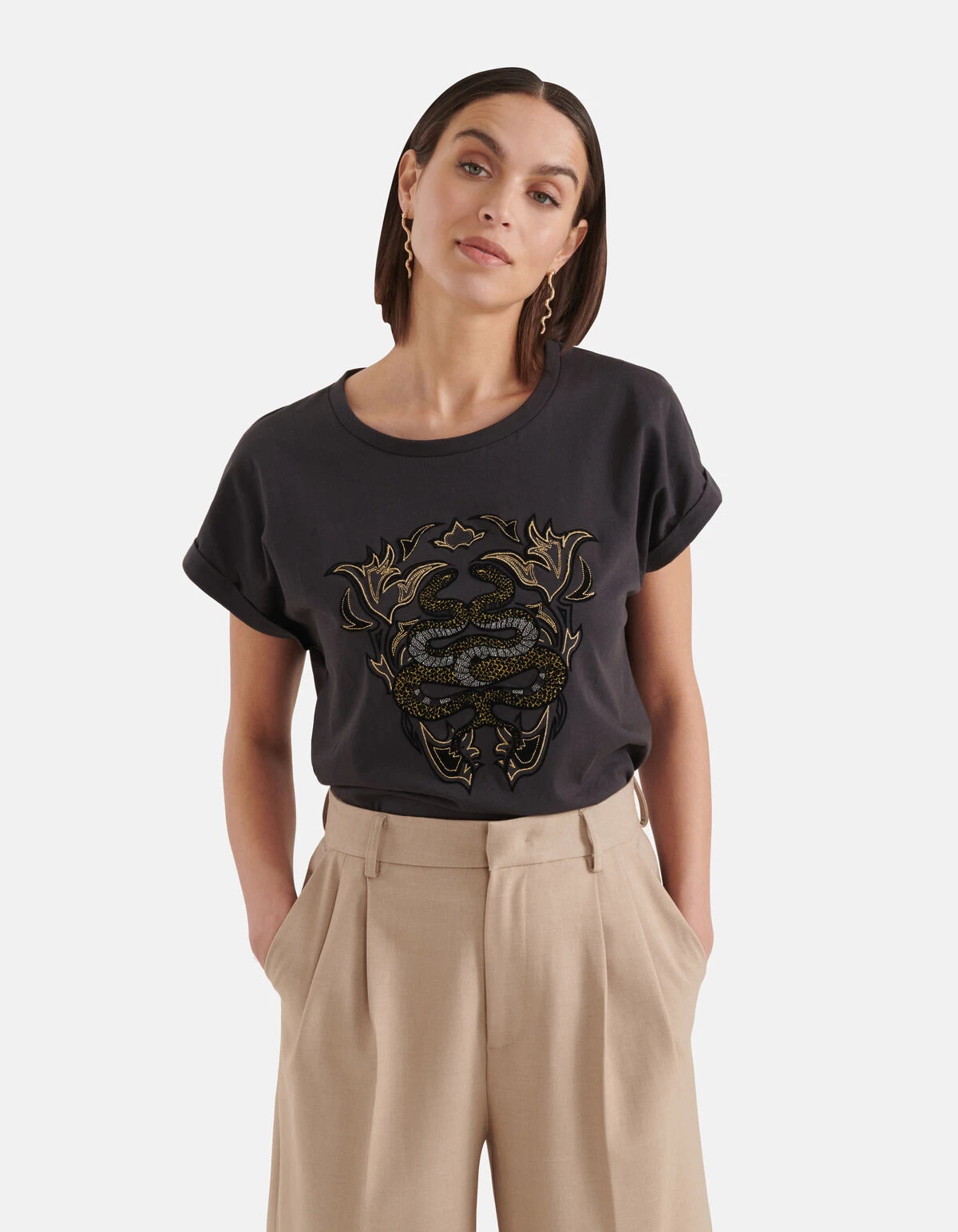 Print it! Het Slangen Embroidery Print T-shirt heeft een korte mouwen, een lage ronde hals en een relaxed fit. Het item wordt gekenmerkt door de donkergrijze kleur met een geborduurde slangenprint op de voorzijde. De print heeft gouden lurexdraad door de stof heen geweven voor een uniek effect. Combineer het samen met een beige pantalon en statement oorbellen voor een stijlvolle look! Het model heeft een lengte van 178 cm en draagt maat S. Het artikel heeft een totale lengte van 60,5 cm bij maat S.
