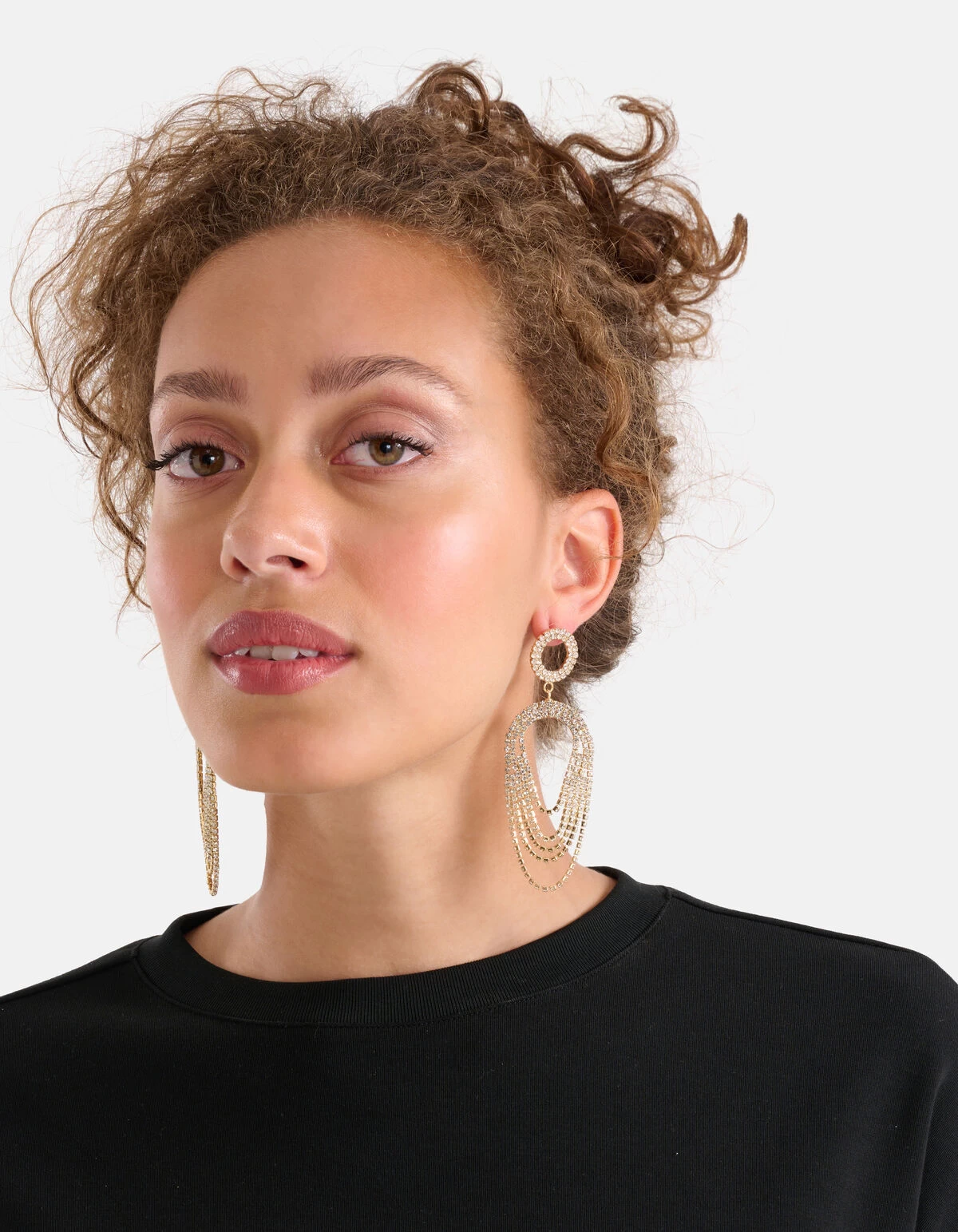 Life is a party, dress like it! Geef je outfit een feestelijke touch met de Strass Drape Oorbellen. Deze oorbellen worden gekenmerkt door de goude kleur, de ronde vorm met all-over strass steentjes. De strass steentjes hebben een zilveren kleur, waardoor ze extra opvallen. Een leuk detail is het gedrapeerde effect bij de hanger. Door de kegelsluiting blijven de oorbellen goed en veilig op zijn plek! Maak je look compleet met een sophisticated outfit en je bent ready to party! De oorbellen hebben een totale lengte van 9 cm.