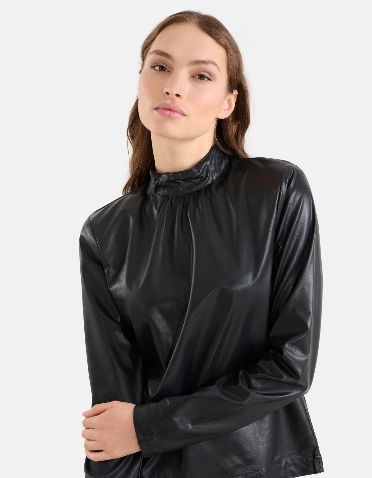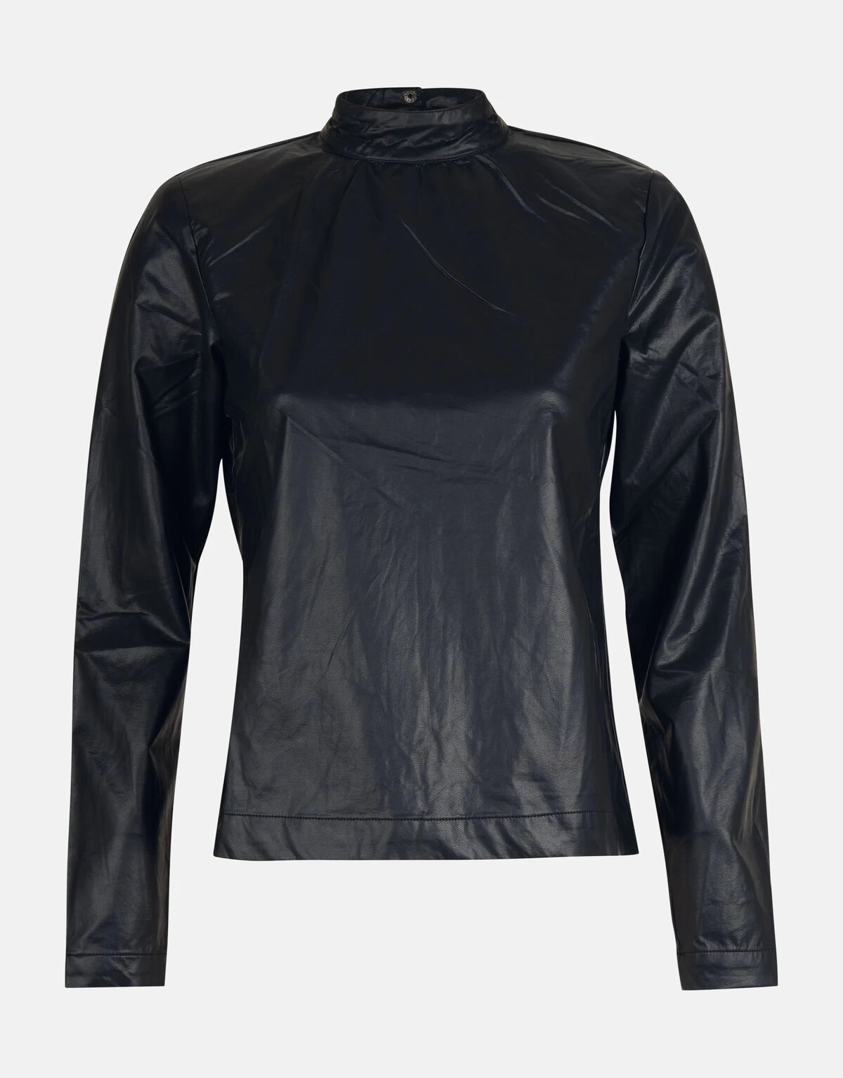 When fashion meets art! Leer items blijven trending en wij snappen waarom. De Vegan Leren Top heeft lange mouwen, een hoge hals, een aansluitende fit, een non-stretch stof en een drukknoopsluiting op de achterzijde. Het item wordt gekenmerkt door de zwarte kleur en een vegan leren stof. Verder heeft de top subtiele schoudervullingen. Wil je geen schoudervulling? dan kan je deze makkelijk los maken via een drukknoop. Het is gemaakt van 100% polyester, hierdoor is het sterk van kwaliteit en vormvast. Combineer het samen met een wide leg denim jeans en strass strik hakken voor een edgy look! Het model heeft een lengte van 177 cm en draagt maat S. Het artikel heeft een totale lengte van 61 cm bij maat S.