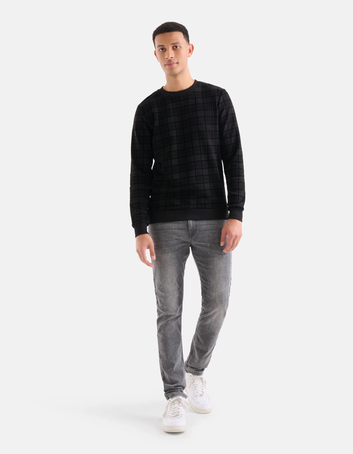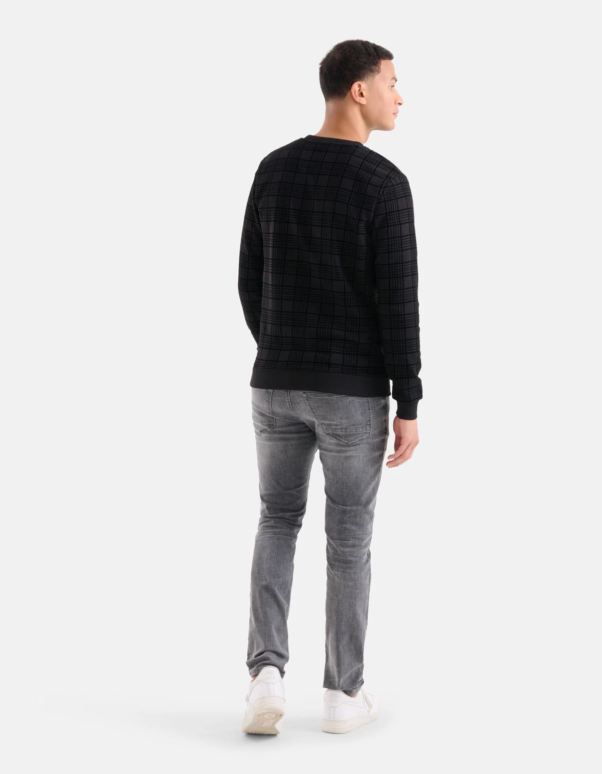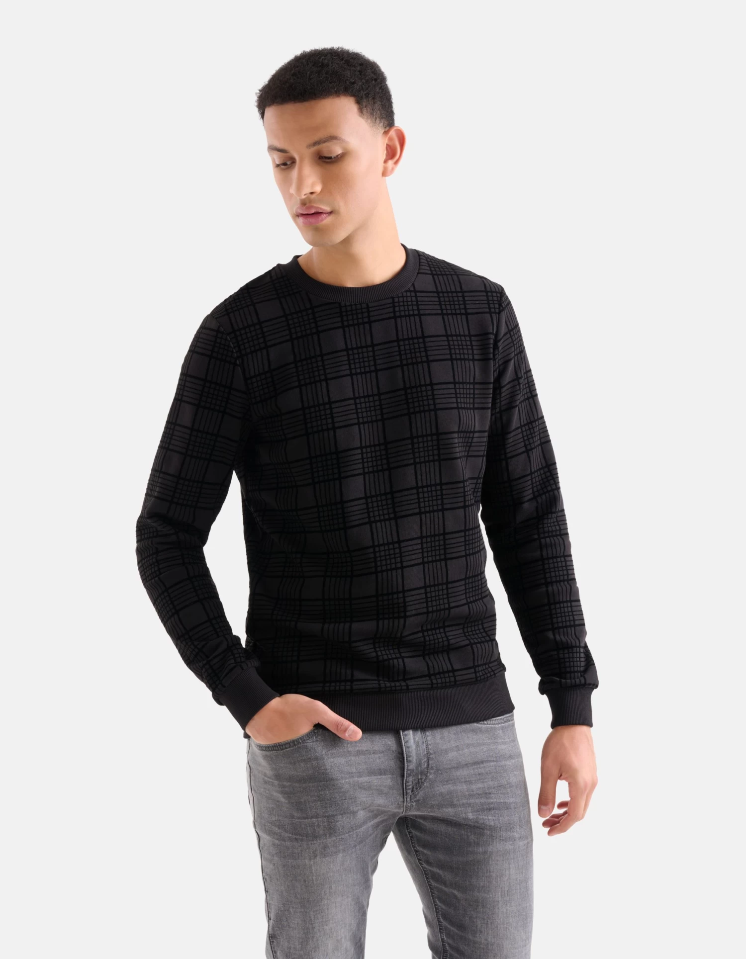 Fearless fashion season! De Velvet Ruiten Sweater heeft lange mouwen, een hoge ronde hals en een regular fit. Het item wordt gekenmerkt door de zwarte kleur met een all-over velvet ruiten print. De print is erop gedrukt via een flock manier, hierdoor zijn de lijntjes geprint op de stof. Op deze manier heeft de sweater een luxueuze uitstraling. Het is gemaakt van katoen en polyester, hierdoor is het sterk van kwaliteit, vormvast en draagt het comfortabel. Combineer het samen met een grijze denim jeans voor een casual look! Het model heeft een lengte van 188 cm en draagt maat M. Het artikel heeft een totale lengte van 71,5 cm bij maat M.