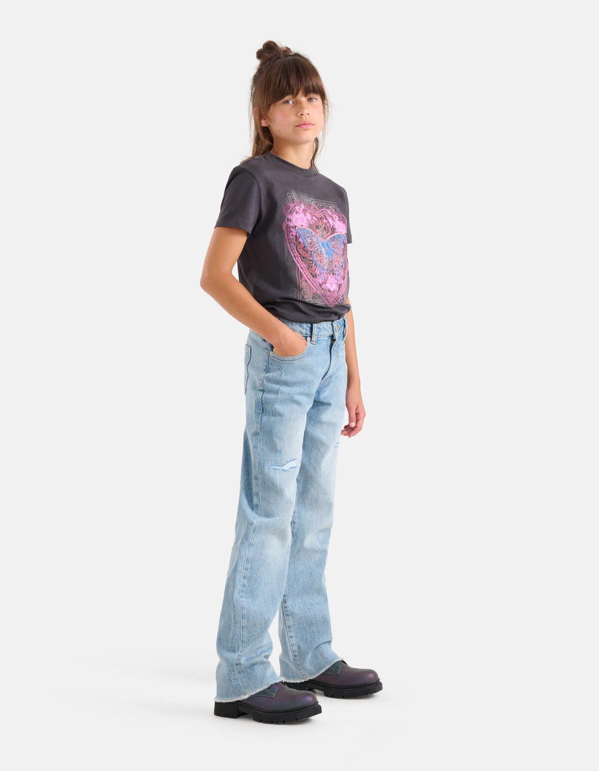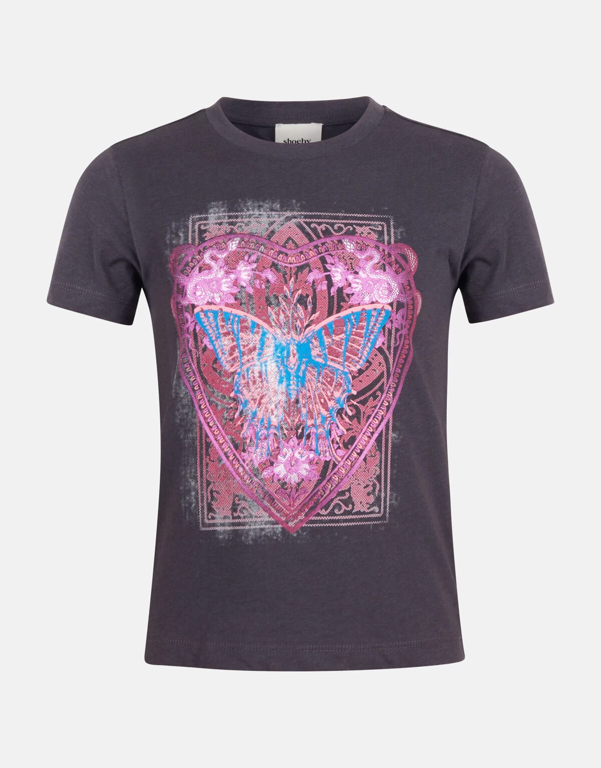 Love at firtst sight! Het Vlinder Artwork T-shirt heeft korte mouwen, een hoge ronde hals, een low-stretch stof en een regular fit. Het item wordt gekenmerkt door de donkergrijze kleur met een artwork op de voorzijde. Op het artwork staat er een grote vlinder afgebeeld met een paars hart eromheen. Het is gemaakt van 100% katoen, hierdoor is het sterk van kwaliteit en draagt het comfortabel. Maak je look compleet met een destroyed straight leg jeans en een paar laarzen en je bent ready to go!
