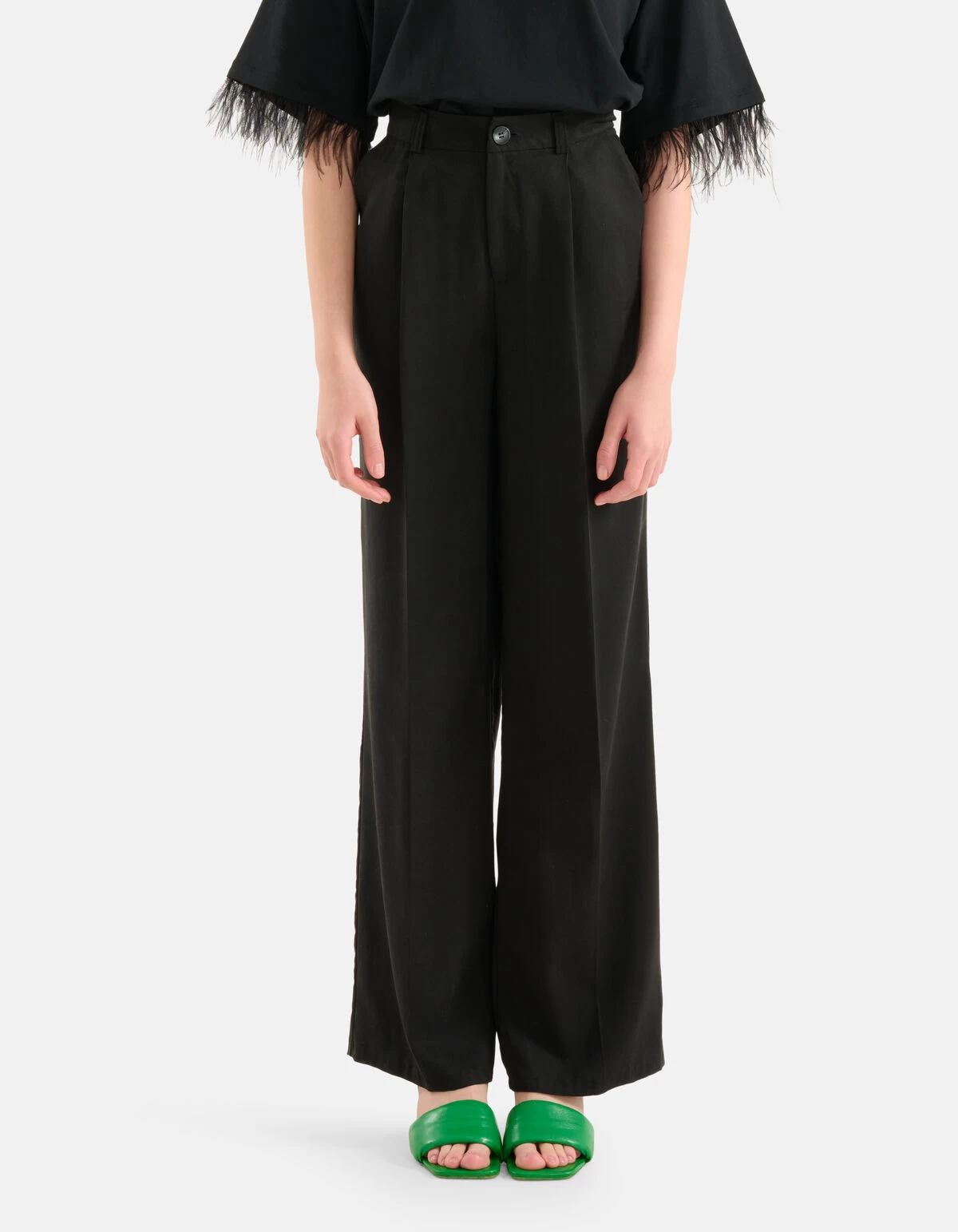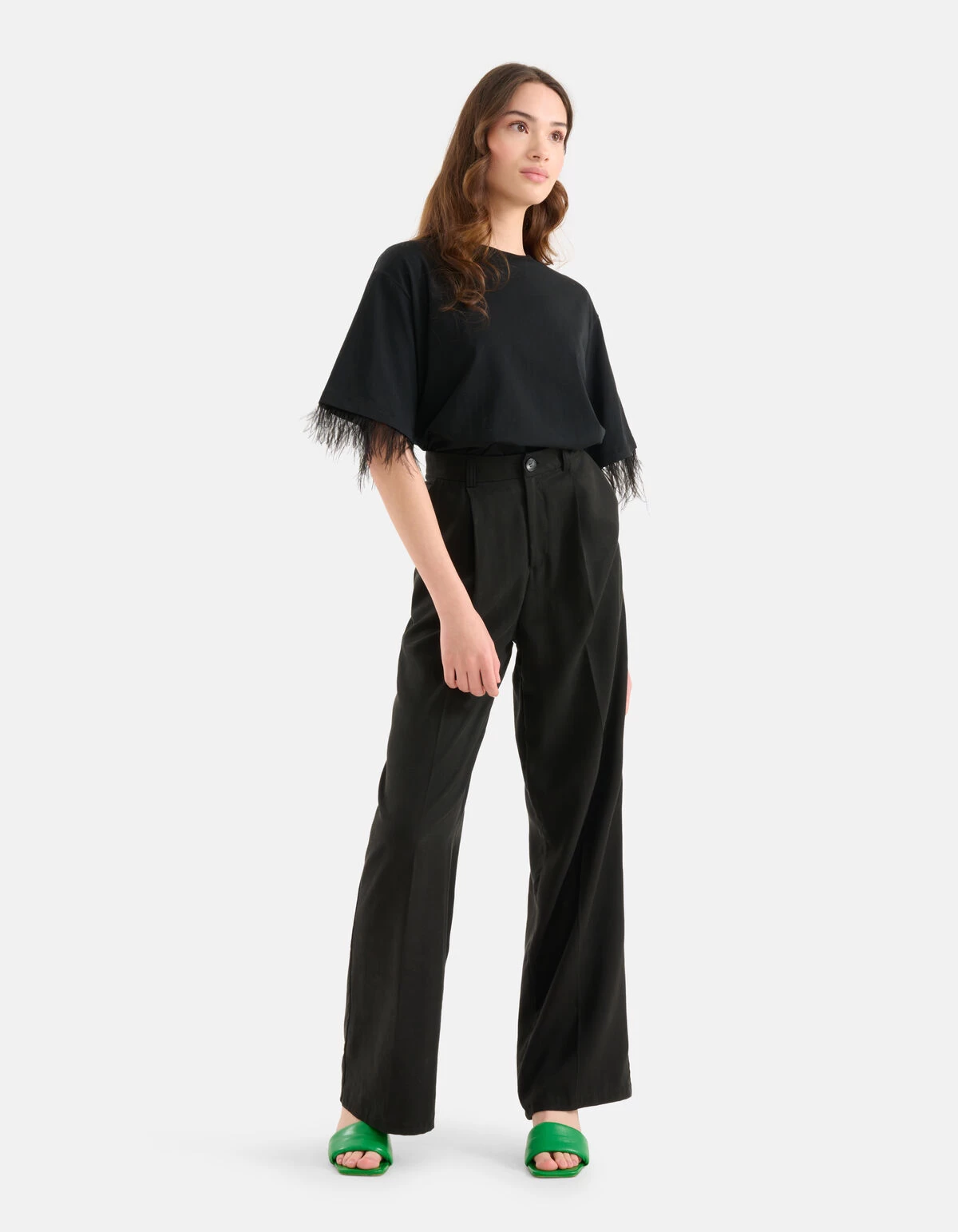 Perfect in black! De Wide Leg Broek heeft een hoge taille, een wide leg, een loose fit, steekzakken en een knoop-en ritssluiting. Het item wordt gekenmerkt door de zwarte kleur en de naad op de voorzijde. Verder heeft het een fijne en luchtige stof, waardoor de broek het hele jaar aan kan! Het is gemaakt van viscose, hierdoor is het kleurvast en draagt het comfortabel. Maak de look compleet met het feather t-shirt en een paar hakken voor een stijlvolle look. Het model heeft een lengte van 174 cm en draagt maat S. Het artikel heeft een binnenbeenlengte van 81,5 cm bij maat S.