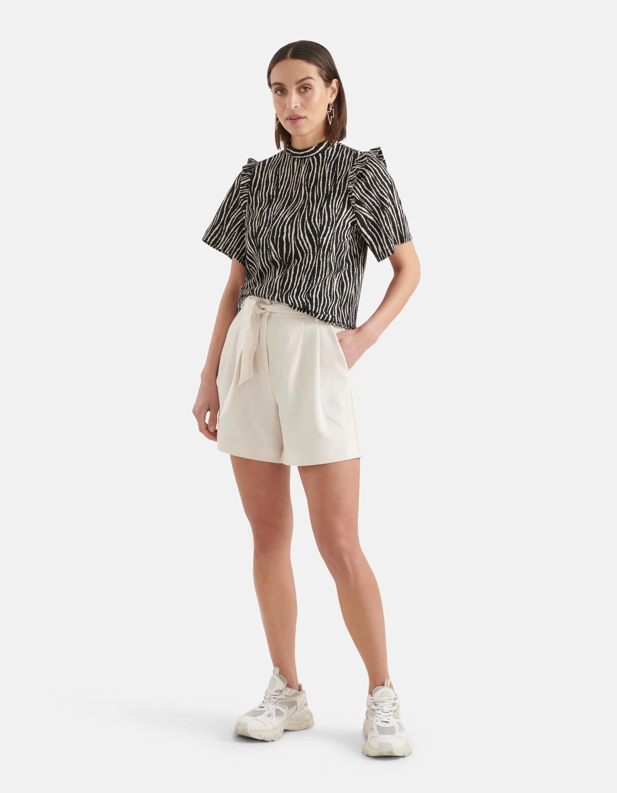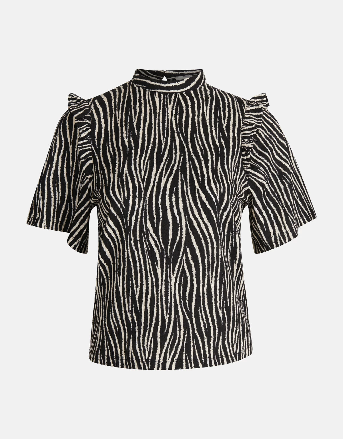 Print it! De Zebra Crinkle Top heeft een korte mouw, een hoge ronde hals, een knoopsluiting op de achterzijde en een regular fit. Het item wordt gekenmerkt door de crinkle structuur in de stof, de zwarte kleur met een all-over zebra print in het wit. Door de crinkle krijgt de top een speels en gekreukt effect. Een leuk detail is de ruffle bij de schouders! Het wordt gemaakt van polyester en elastaan. Door deze samenstelling is het sterk van kwaliteit, rekbaar en heeft het een hoog draagcomfort. Maak de look compleet met een witte short en chunky sneakers! Het model heeft een lengte van 178 cm en draagt maat S. Het artikel heeft een totale lengte van 56,5 cm bij maat S.